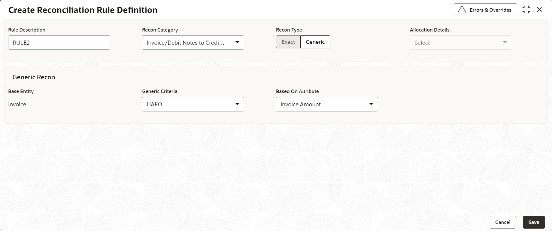 This topic describes the systematic instruction for setting up recon rule for ‘Generic’ reconciliation category.