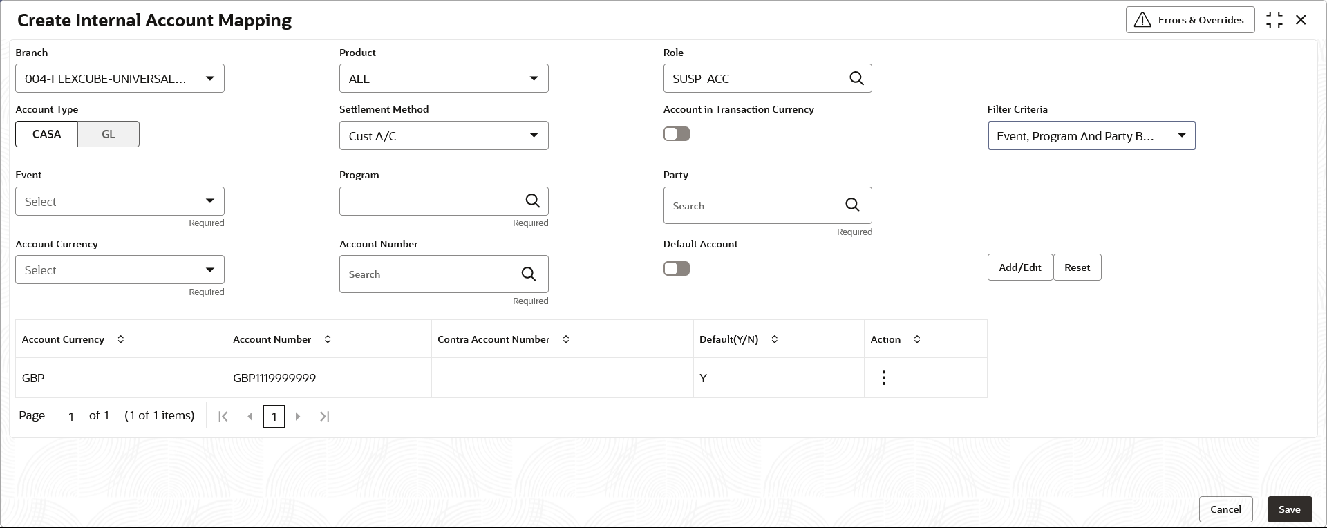 Role Click the search icon to select the accounting role to map the account to. Account Type Switch the toggle button to select either CASA or GL for the mapping. Settlement Method Select the settlement method corresponding to the account type. Account in Transaction Currency Use this toggle button to specify whether the accounting should be done in transaction currency or not. Filter Criteria Select any one of the following criteria: - Party and Division Code Based