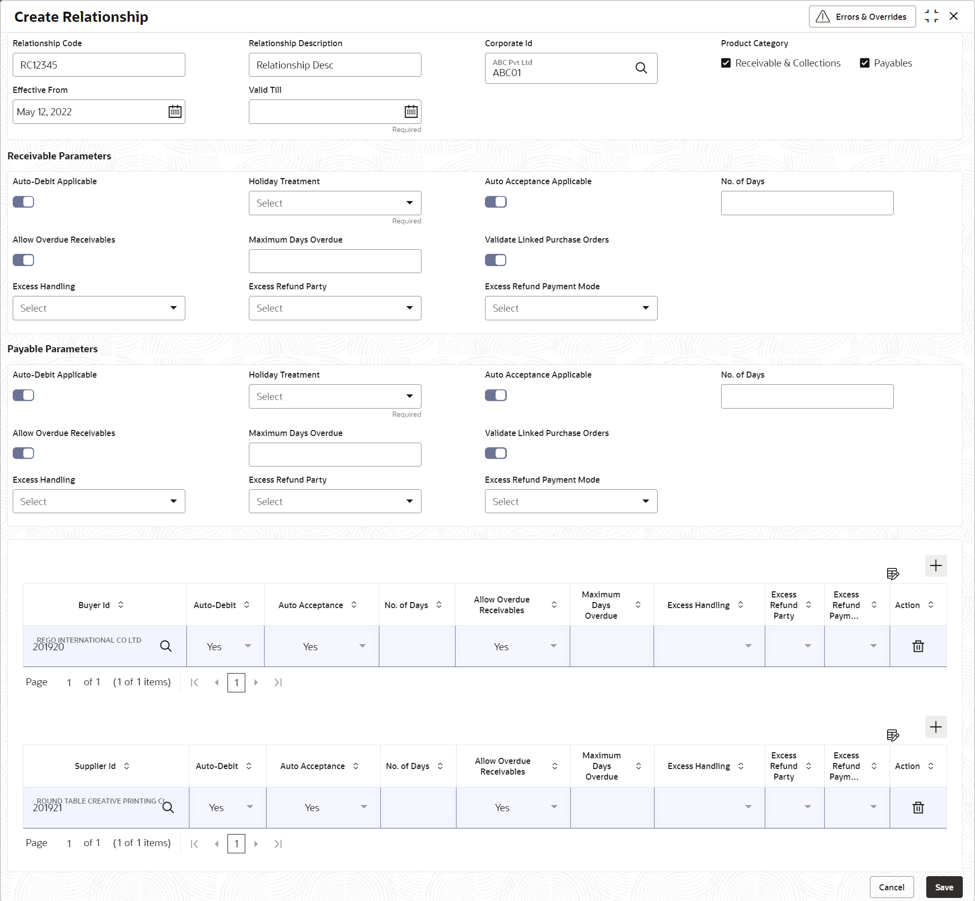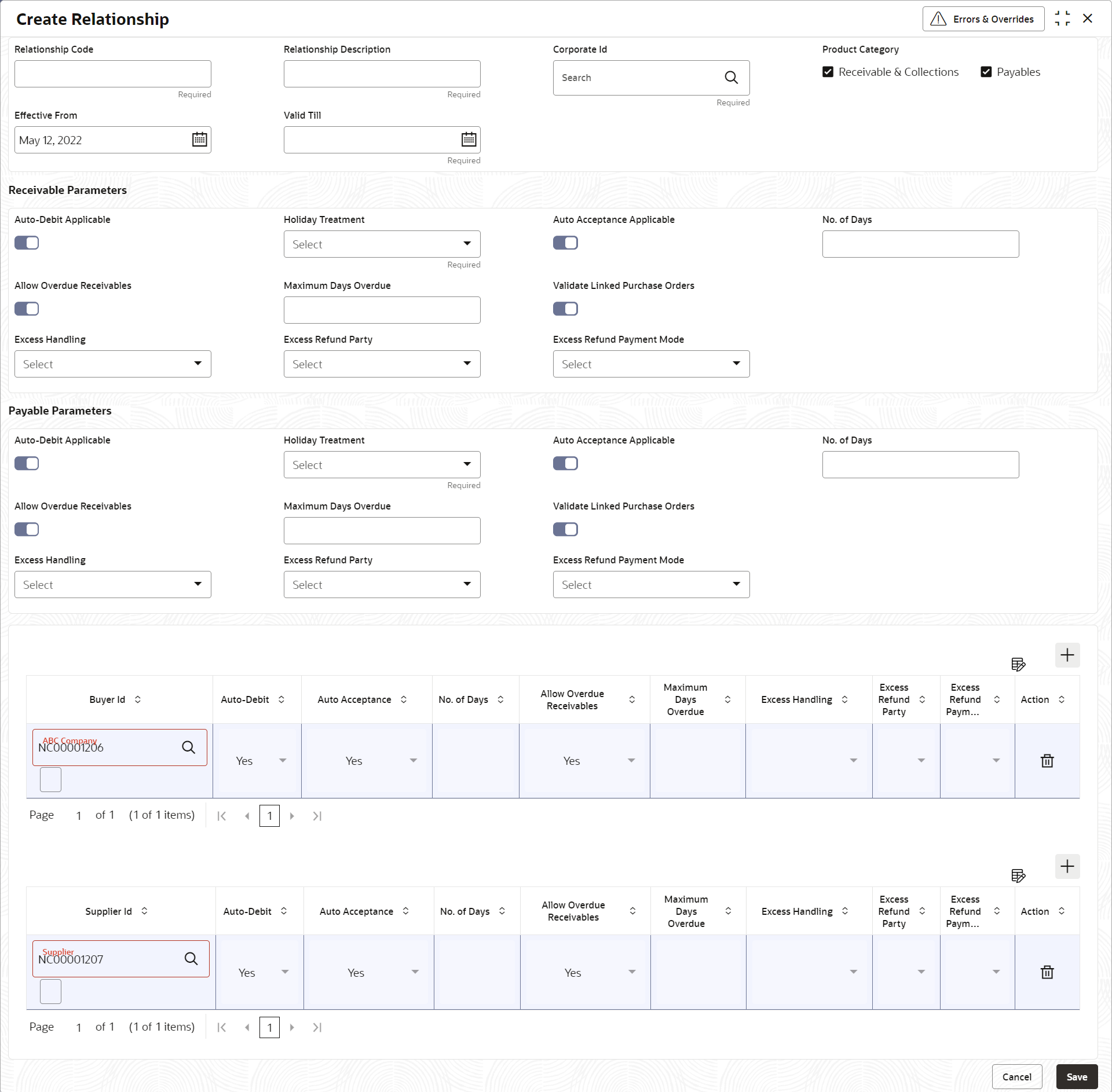Relationship Description Specify the description of the code. Corporate Id Click the Search icon to select the corporate for whom the linkage to counterparty is required. Product Category Select the applicable product categories as Receivables and Collections and/or Payables. The Search fields and result data grid for each category is displayed upon selecting the category.