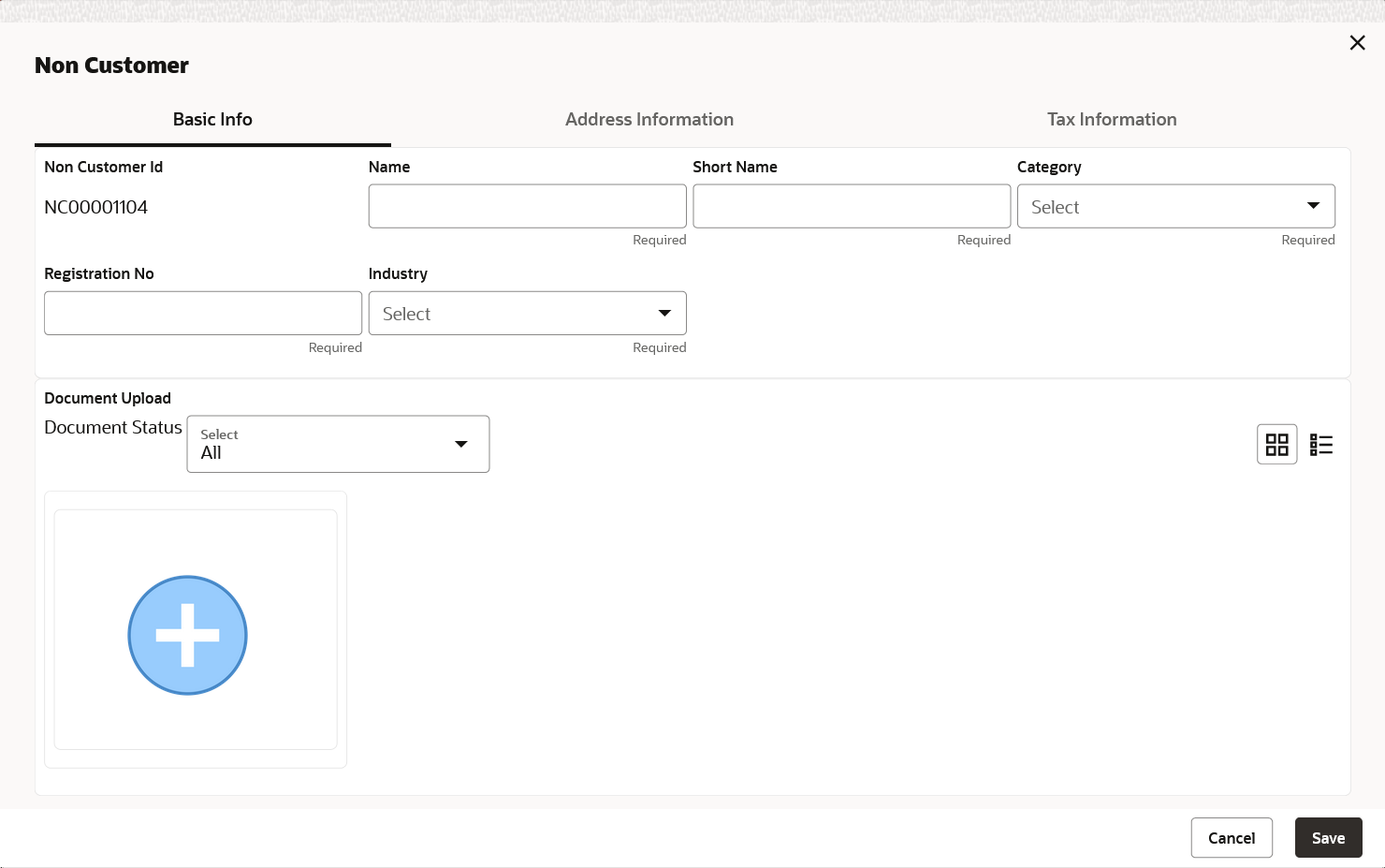 Relationship cannot be created between non-customers, i.e., non-customers cannot be added if the selected Corporate Id is a non-customer.The Non Customer - Basic Info screen displays. - In the Basic Info tab, specify the non-customer basic details such as name, category, registration number, and industry. The user can also upload documents of the non-customers.