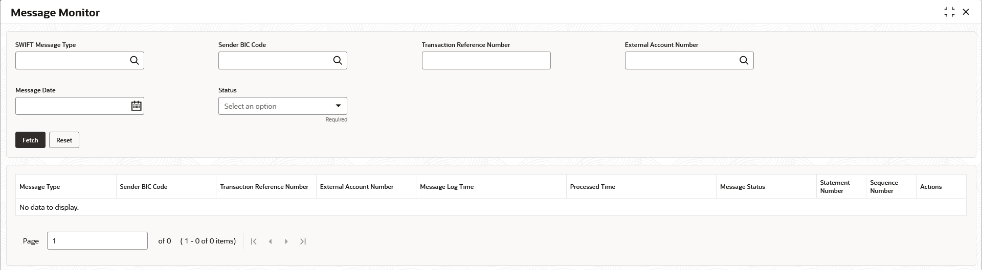 Sender BIC Code Click Search icon to view and select the sender BIC code of the message. Transaction Reference No. Specify the transaction reference number of the message. External Account No. Click Search icon to view and select the external account number. Message Date Select the date of the incoming message. Status Select the status of the message from drop-down list The available options are:.- Processed (P)