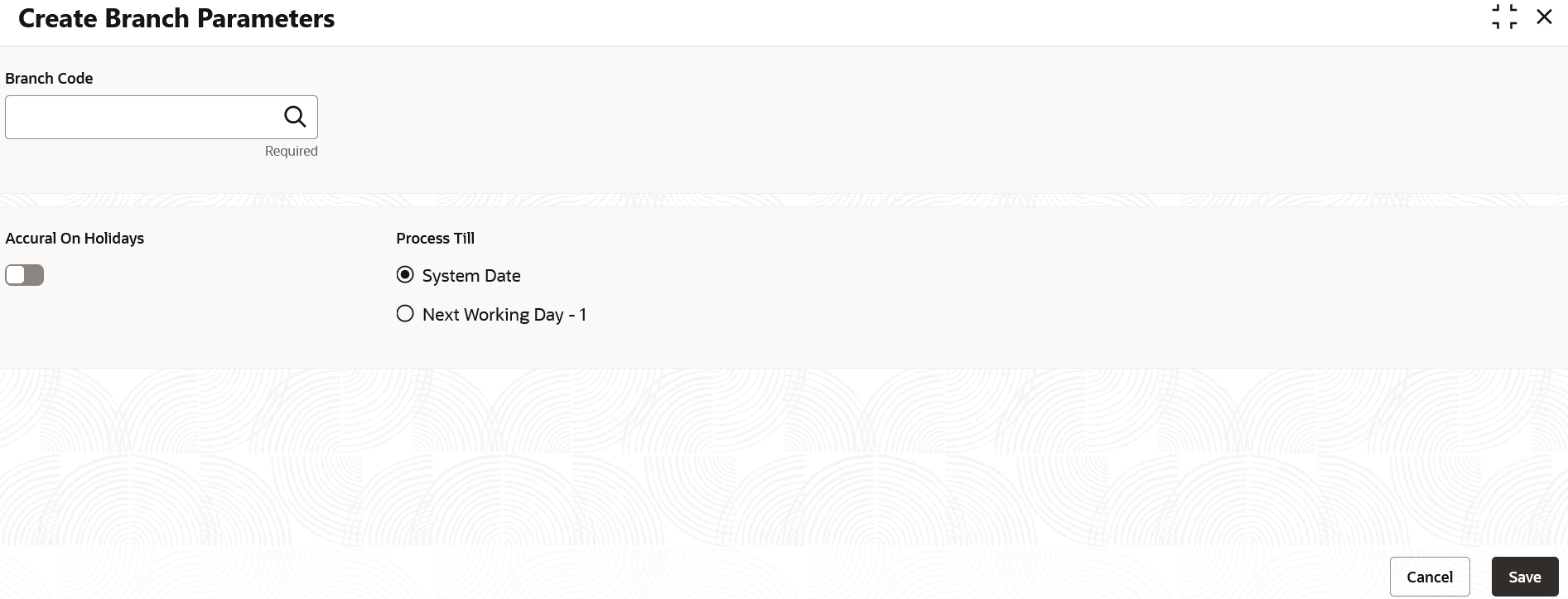 This topic describes the systematic instructions to configure the interest and charges at branch level parameters.