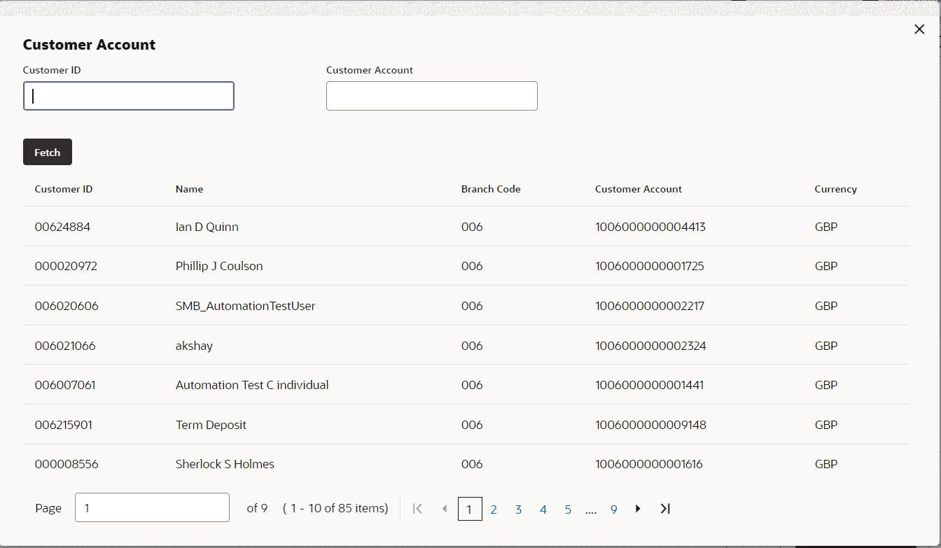 Field Description Customer ID Displays the customer ID. Name Displays the customer name. Branch Code Displays the branch code. Customer Account Displays the customer account number. Currency Displays the currency of the customer account.