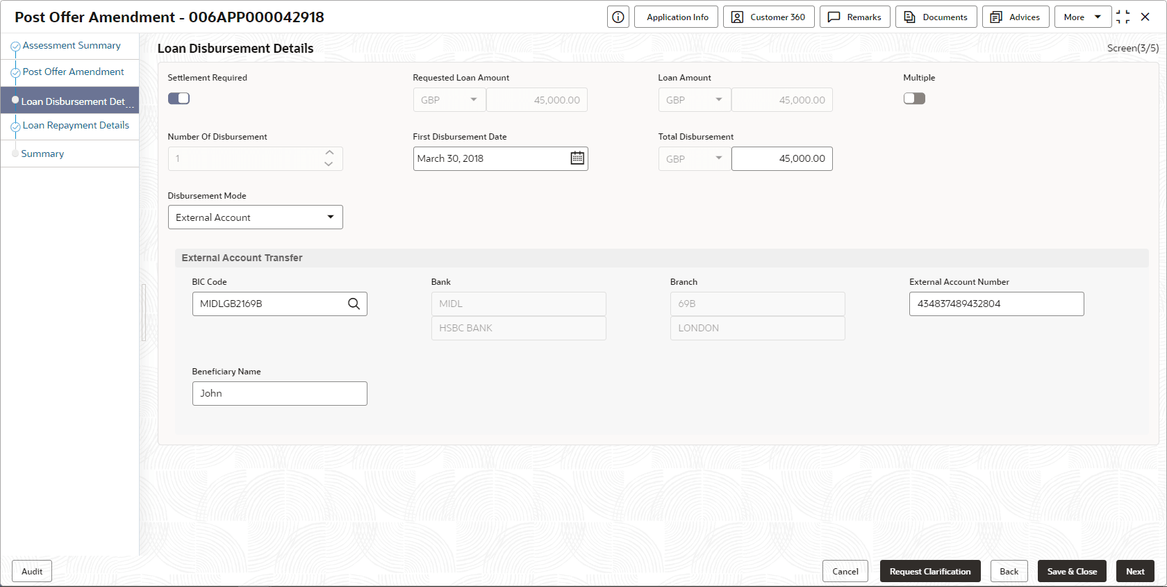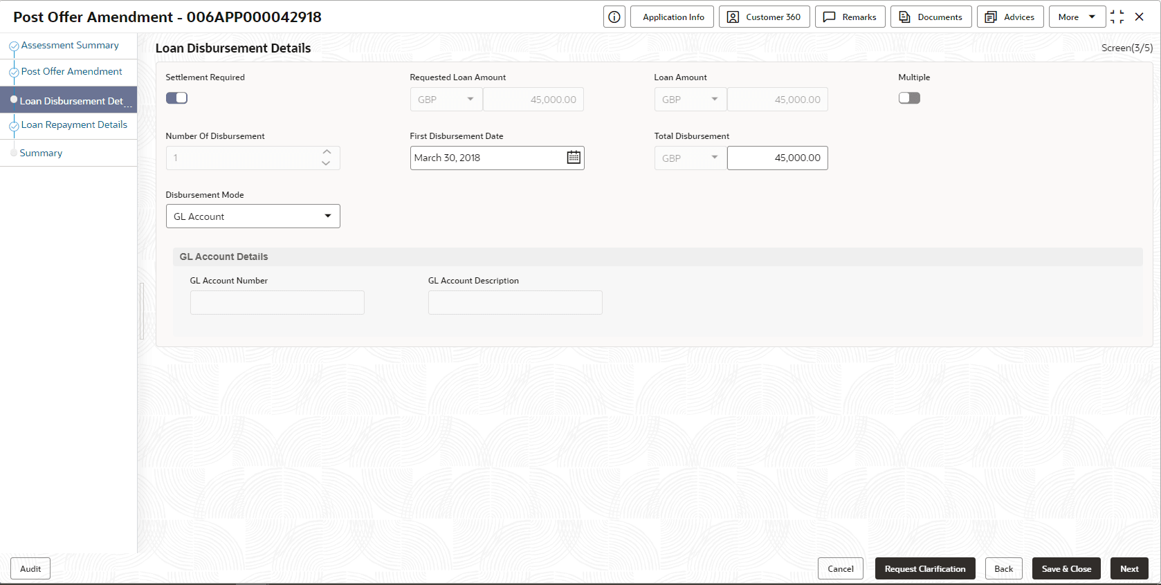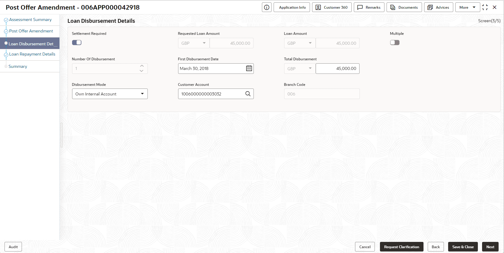 This topic describes systematic instructions to configure loan disbursement post offer amendment details.