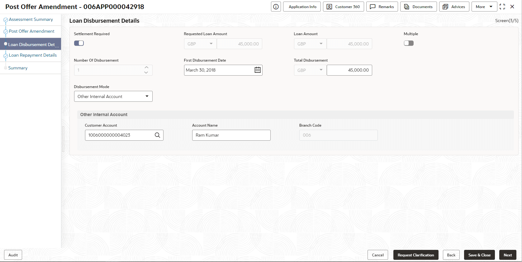 The Loan Disbursement Details - Own Internal Account screen displays.Figure 2-64 Loan Disbursement Details – Own Internal Account