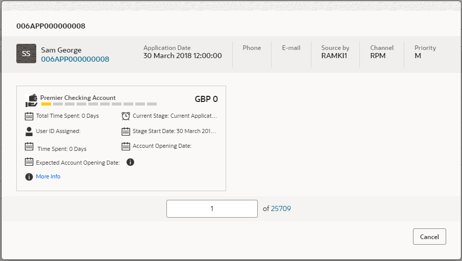 Displays the information on the features considered to predict the expected account opening date. More Info Click More Info hyperlink to view more details about the customer clarification raised. Application Number Displays the application number. - Click