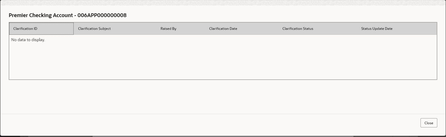 Status Update Date Displays the date on which status was updated. New Clarification Click New Clarification to raise a new clarification request. - Select any specific clarification request row.The Clarification Details for the selected clarification request displays.