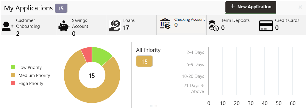 Field Description Customer Onboarding Displays the total number of new customer onboarding requests initiated in the application. Savings Account Displays the total number of Saving Accounts requests initiated in the application. Loans Displays the total number of Loans requests initiated in the application. Checking Account Displays the total number of Checking Account requests initiated in the application. Term Deposits Displays the total number of Term Deposits requests initiated in the application. Credit Cards Displays the total number of Credit Cards requests initiated in the application. Donut view displays the total number of applications initiated by the user, divided into the priorities allocated to the application during initiation.