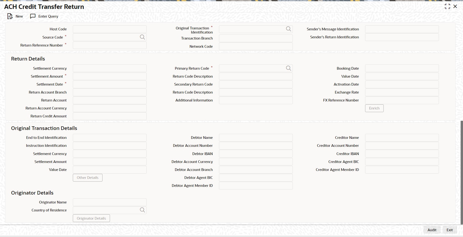 This date is rolled over only if the processing is delayed in any Exception Queue and the Return transaction is released from the queue on a later date. No holiday check is done on Return Activation Date.Return Account Specify the Return Account Enrich Click on Enrich button upon providing above details. Original Transaction Details: Specify the Origination Transaction Detail fields.
