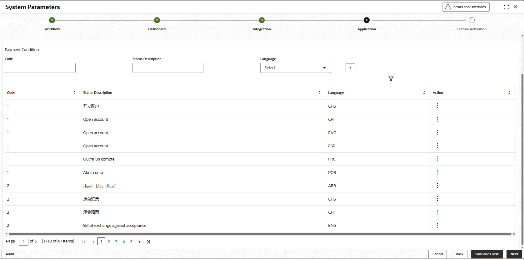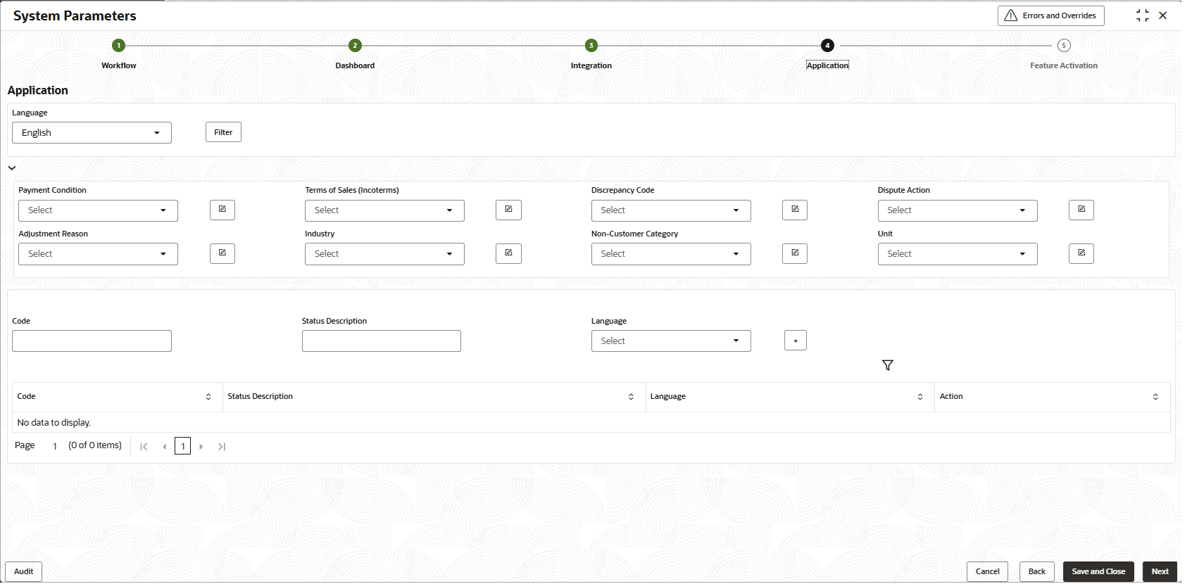 Field Name Description Parameter Name Displays the name of the application parameter selected for modification. Code Specify the unique code to be created for the selected application parameter. Status Description Specify the description for the code to be created. You can specify the description in the required language. Language Select the language for which the code is to be created. - Once you enter the details, click the