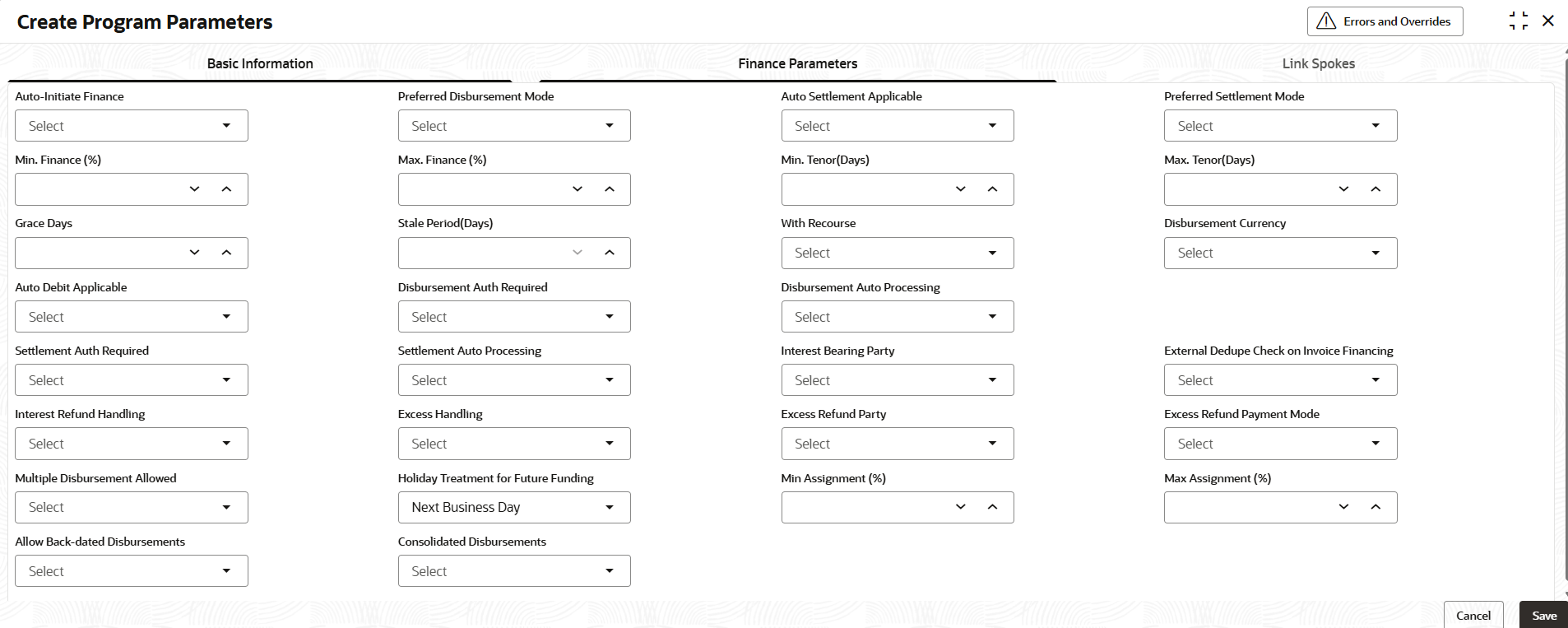spokes/counterparties to the anchor and configure the finance parameters.For more information on fields, refer to the field description table.