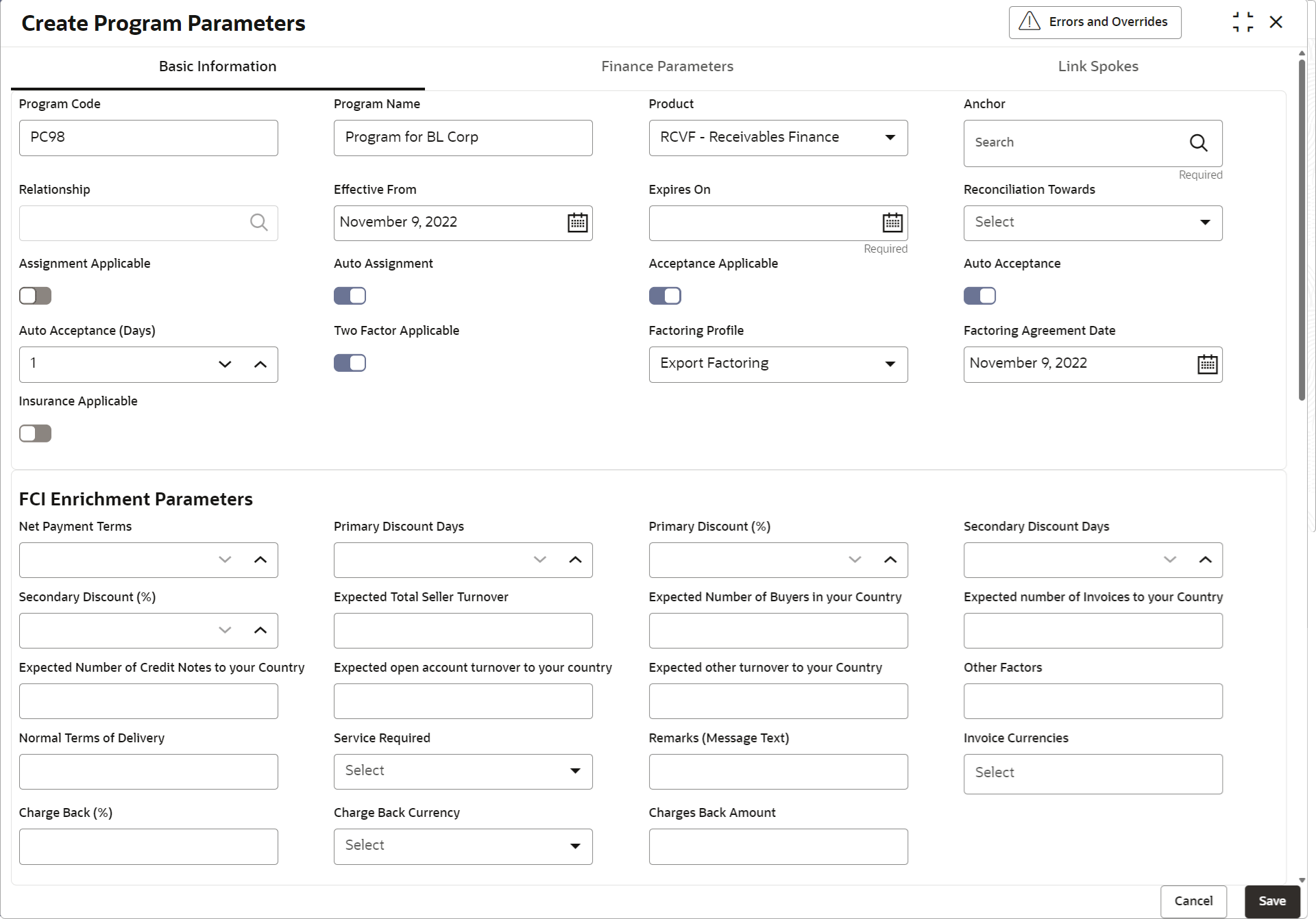 configure the finance parameters for the program being created.For more information on fields, refer to the field description table.