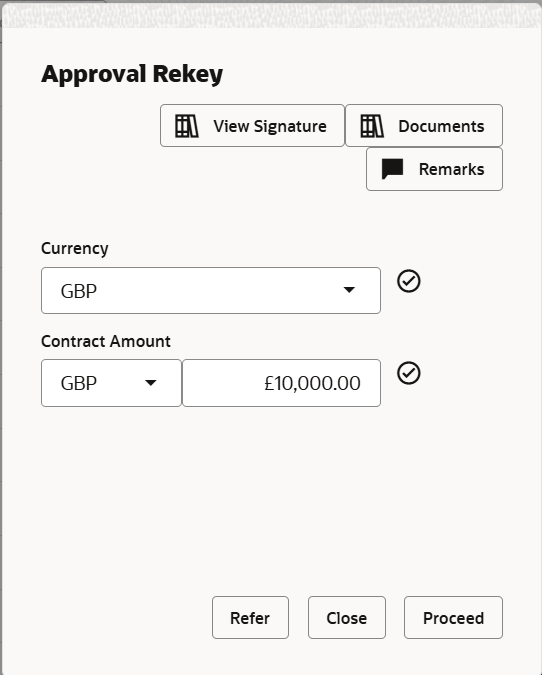 Description of the illustration approvalrekey.pngFor non online channel, application will request approver for few critical field values as an authorization step. If the values captured match with the values available in the screen, system will allow user to open the transaction screens for further verification. If the re-key values are different from the values captured, then application will display an error message.