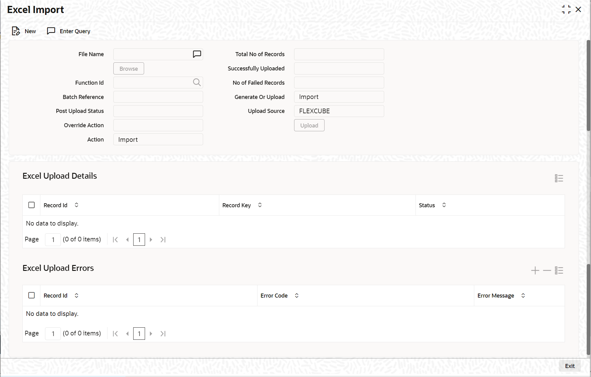 Field Description File Name Select the excel file to be imported by clicking ‘Browse’ button. Total No of Records The total number of records to be uploaded is displayed here. Function Identification The function id mentioned in the excel file chosen is displayed here. Batch Reference The unique reference number generated for an upload is displayed here. Post Upload Status Select the status to be set for the file post upload, from the drop-down list. The following statuses are available in the drop-down list: - Authorized