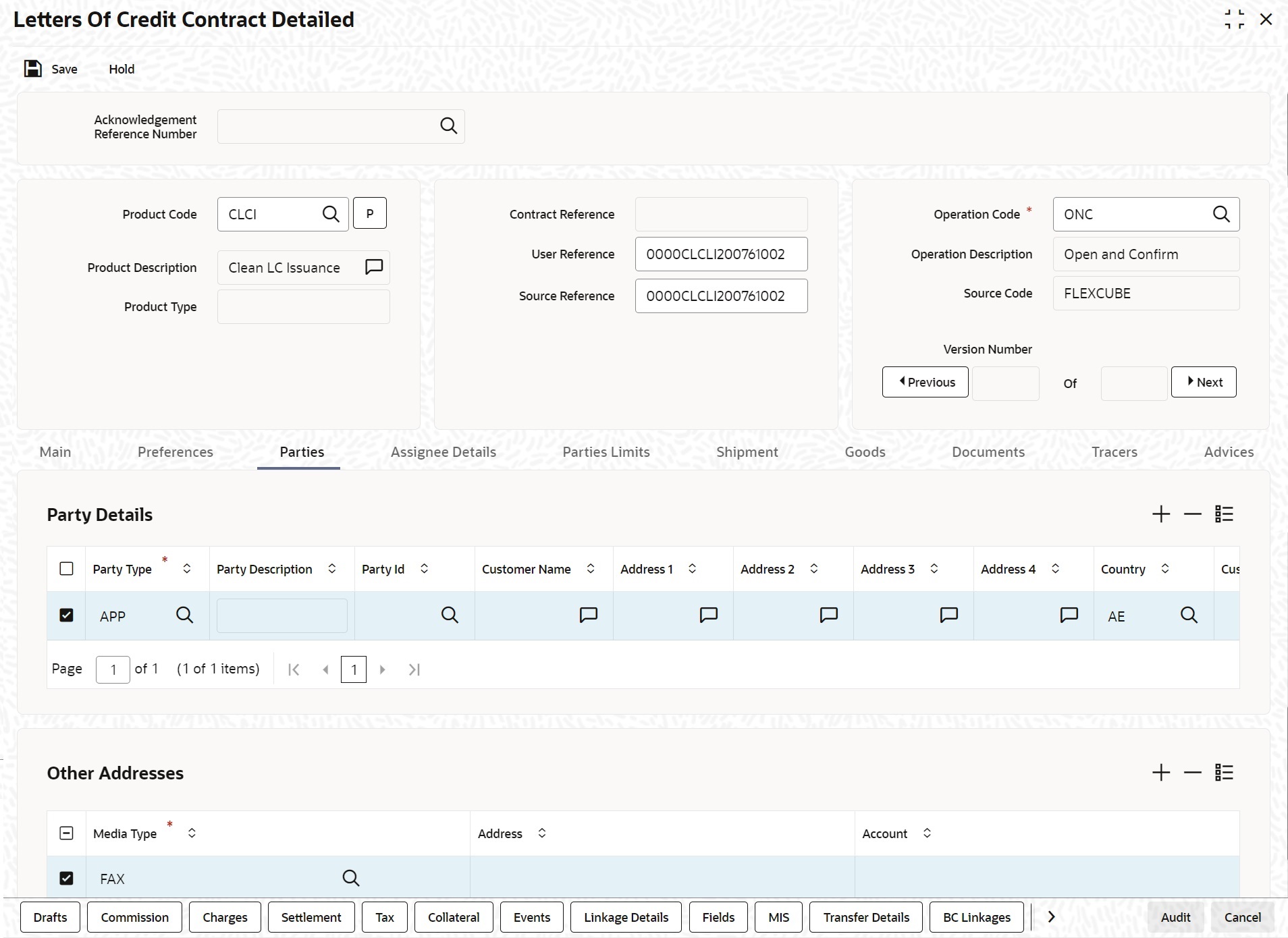 Customer Name If none of the parties in the LC is a customer of the bank, you must enter the CIF ID defined for the walk-in customer and give the details of one of the parties for it. The party type of the counterparty of the LC is defaulted based on the type of LC you are processing. If you process an import LC APP (indicating applicant) is defaulted. We can modify either APB or ACC for an import LC. So the accounting entires and advices will get generated for the counter party. If you process an export LC ‘BEN’ (indicating beneficiary) is defaulted. You can change the default.