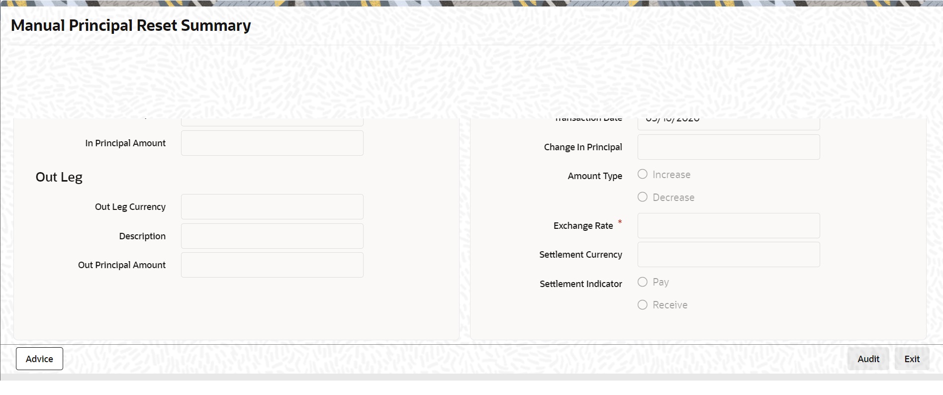 Derivatives User Guide Process a Derivatives Contract Rate Fixing Manual Principal Reset Summary 5.10.7 Manual Principal Reset Summary On the Home page, type in the text box, and click the next arrow. Manual Principal Reset Summary screen is displayed. Figure 5-33 Manual Principal Reset SummaryDescription of "Figure 5-33 Manual Principal Reset Summary" On the Manual Principal Reset screen, specify the details as required. The Following details are displayed here: Authorization Status Contract Status Counterparty Contract Reference Source System Event Code Exchange Rate Change in Principal Marker Id Checker Id Parent topic: Rate Fixing