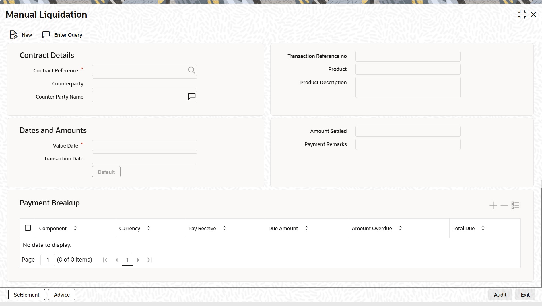 An automatic settlement is done on schedule payment days by the Automatic Contract Update program. Even if you have defined a deal with automatic liquidation, you can liquidate it manually on or after the schedule date through the Manual liquidation screen.