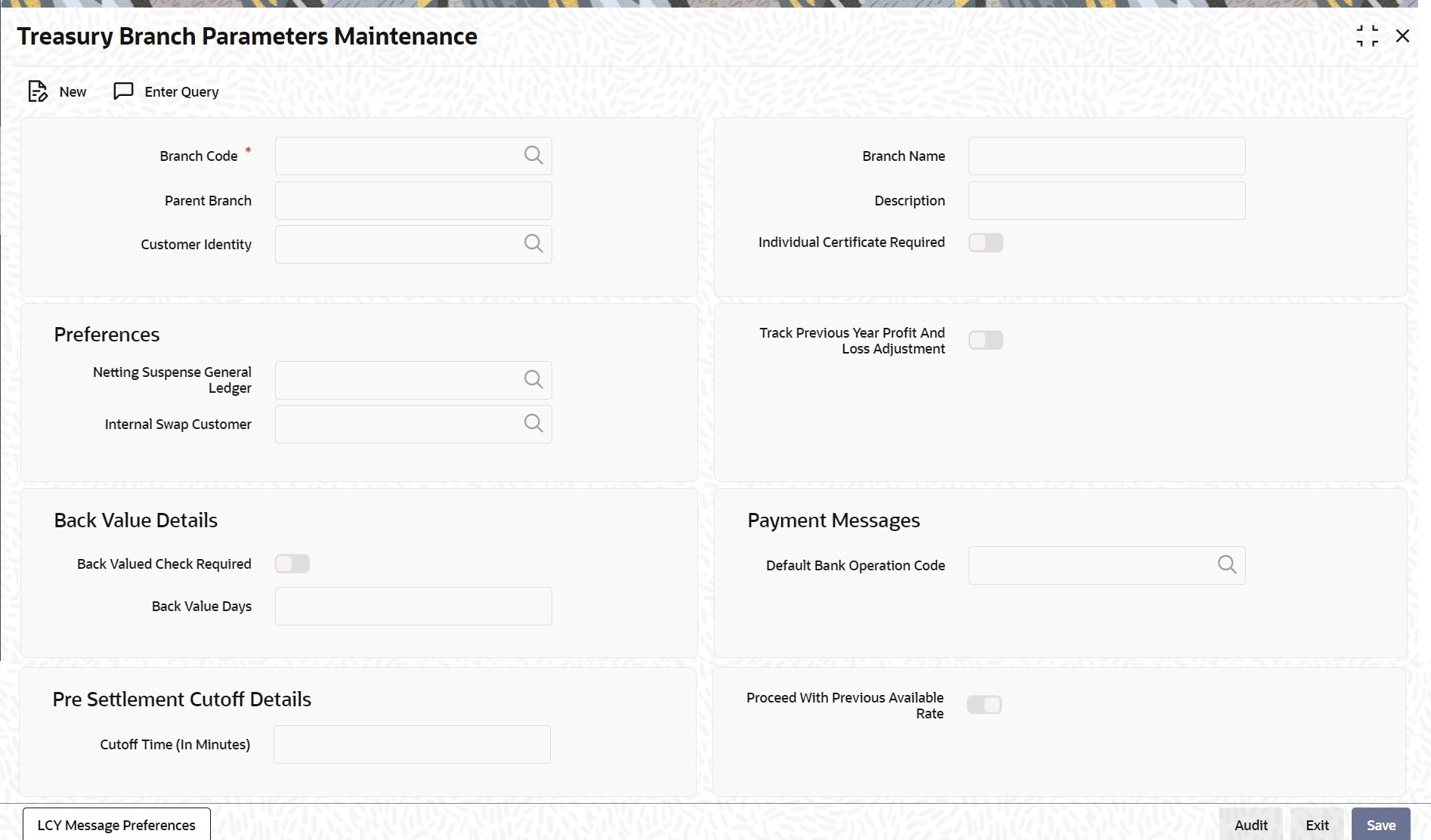 Derivatives User Guide Process a Derivatives Contract Rate Fixing Treasury Branch Parameter Maintenance 5.10.1 Treasury Branch Parameter Maintenance On the Home page, type STDTRBRN in the text box, and click the next arrow. Treasury Branch Parameter Maintenance screen is displayed. Figure 5-30 Treasury Branch Parameter MaintenanceDescription of "Figure 5-30 Treasury Branch Parameter Maintenance" On the Treasury Branch Parameter Maintenance screen, specify the details as required. For more information, refer to the Core Entities and Services User Manual, section 2.2 Treasury Branch Parameters Maintenance Parent topic: Rate Fixing