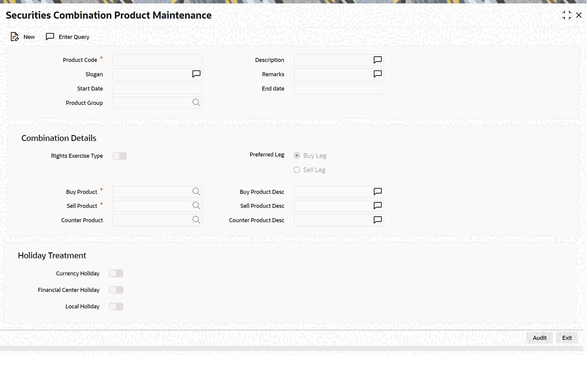 The Securities Combination Product Maintenance screen is invoked from the Application Browser. To enter the details of a new deal, click new icon from the tool bar.