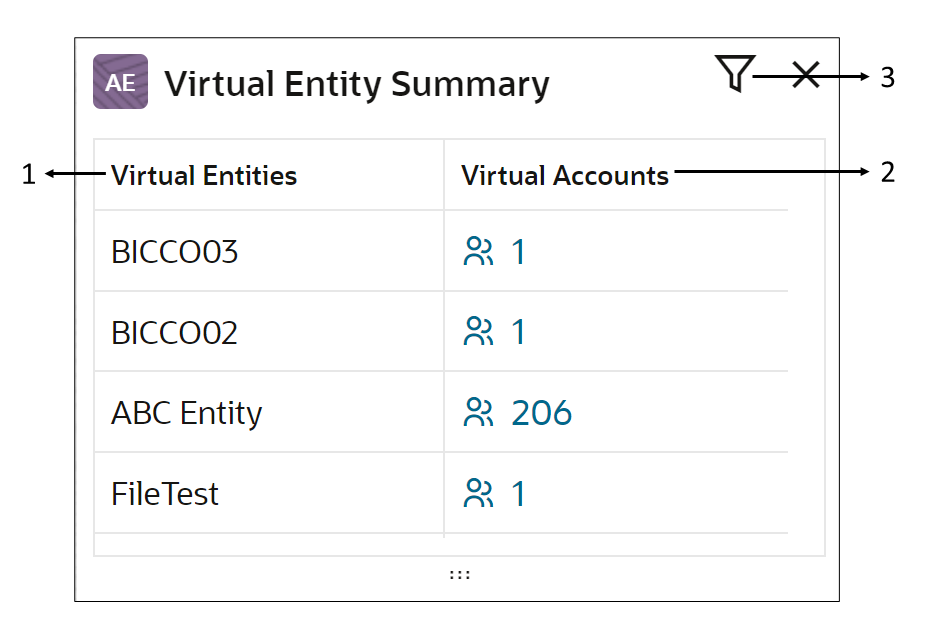 This topic provides information about Virtual Entity Summary, The user can view the summary of virtual entities of the customer selected in Corporates widget.