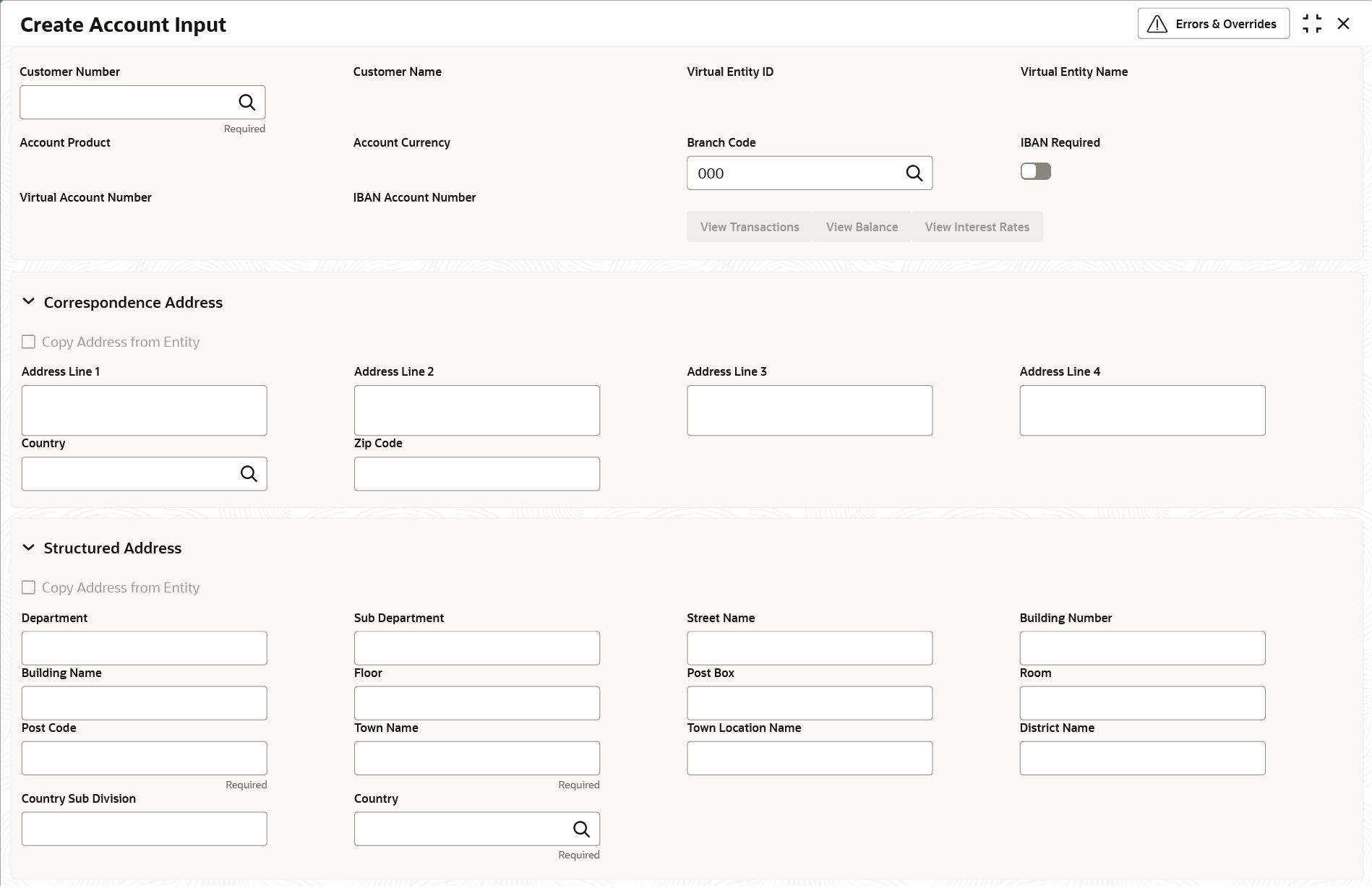 Field Description Customer Number Click Search icon to view and select the required customer number. Customer Name Based on the Customer Number selected, the information is auto-populated. Virtual Entity ID Click Search icon to view and select the required virtual entity ID. Virtual Entity Name Based on the Virtual Entity ID selected, the information is auto-populated. Account Product Click Search icon to view and select the required account product. Account Currency Click Search icon to view and select the required account currency. Displays the list of currencies based on the currency restrictions configured in Customer Account Product.