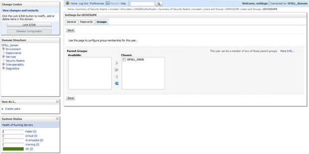 Application Installation Guide Create Domains, Repositories, Data Sources Creating User Groups and Users Assigning Users to Groups 2.6.3 Assigning Users to Groups The USERS are automatically mapped to default application group - OFSLL_USER. Figure 2-63 User group 4Description of "Figure 2-63 User group 4" Parent topic: Creating User Groups and Users