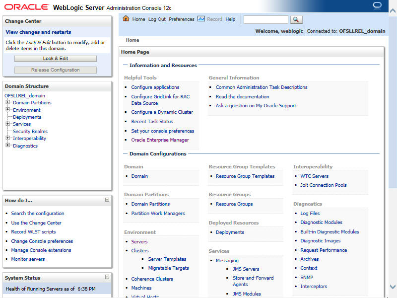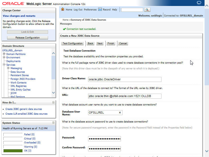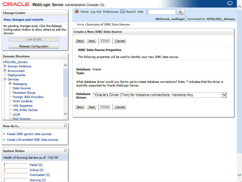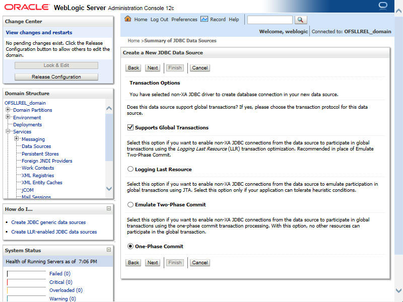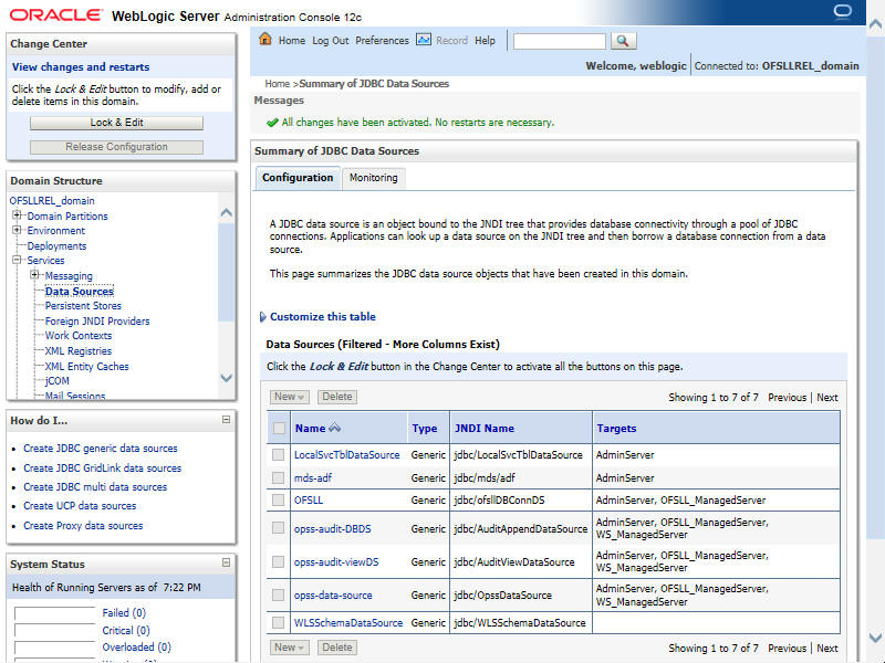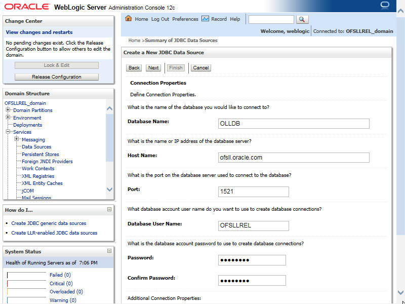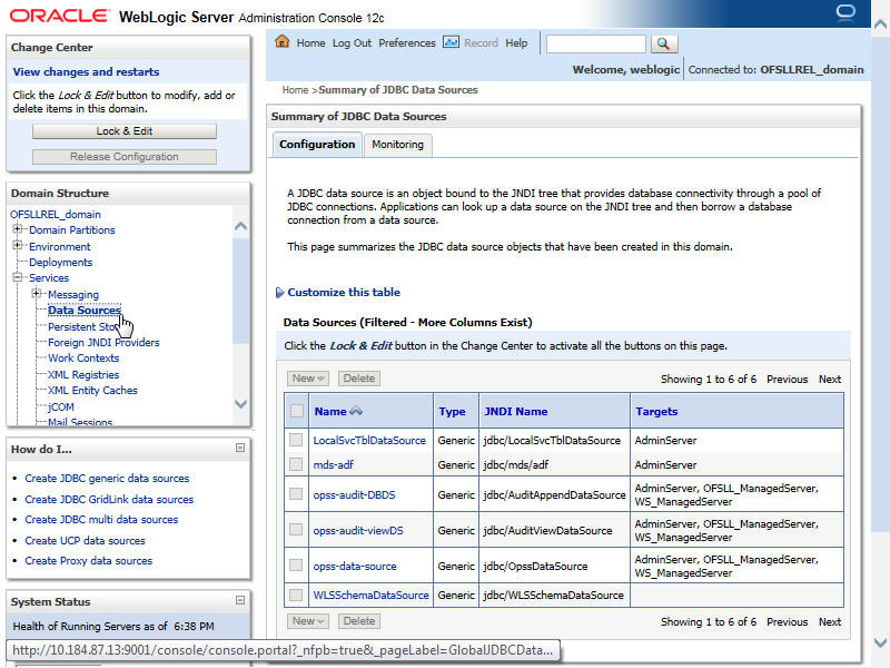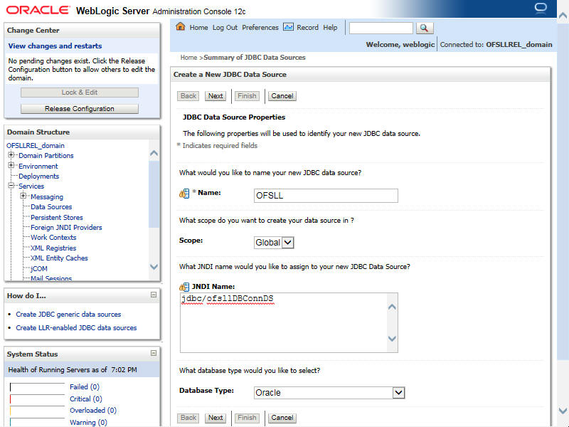 1. Select Services > Data Sources > select the OFSLL data source > Connection Pool.