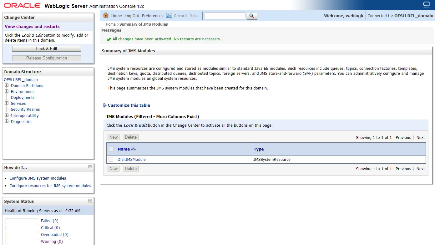 Application Installation Guide Configure JMS Queue AQ-JMS Queue Configuration Create JMS Module 8.2.2 Create JMS Module Follow the below steps to create JMS module. Login to WebLogic Server 12c console (http://hostname:port/console) by specifying the Weblogic administrator user name and password. Click Domain Name > Services > Messaging > JMS Modules. The following window is displayed. Figure 8-18 Create JMS Module 1Description of "Figure 8-18 Create JMS Module 1" Click New.The following screen is displayed. Figure 8-19 Create JMS Module 2Description of "Figure 8-19 Create JMS Module 2" Specify the following details: Enter the System Module Name as OfsllJMSModule Enter the Description File Name as OfsllJMSModule Click Next.The following screen is displayed. Figure 8-20 Create JMS Module 3Description of "Figure 8-20 Create JMS Module 3" Select the target server and click Next.The following window is displayed. Figure 8-21 Create JMS Module 4Description of "Figure 8-21 Create JMS Module 4" Click Finish to save and activate the changes. Once done, the following window is displayed. Figure 8-22 Create JMS Module 5Description of "Figure 8-22 Create JMS Module 5" Parent topic: AQ-JMS Queue Configuration