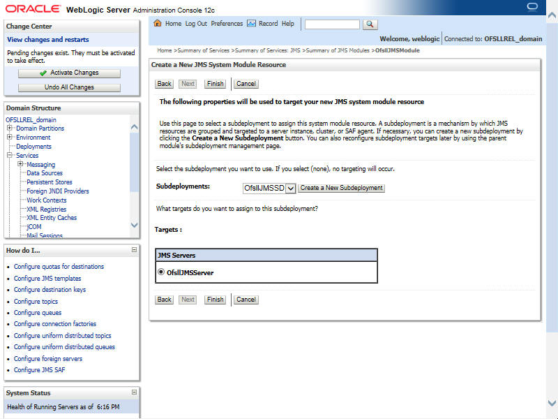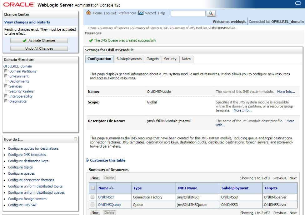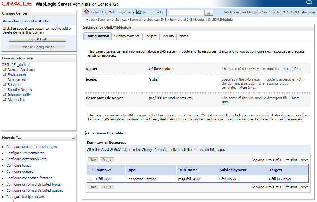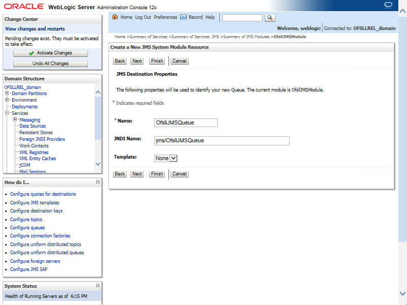Application Installation Guide Configure JMS Queue AQ-JMS Queue Configuration Create JMS Queue 8.2.5 Create JMS Queue Follow the below steps to create JMS queue. Login to WebLogic Server 12c console (http://hostname:port/console) by specifying the Weblogic administrator user name and password. Click Domain Name > Services > Messaging > JMS Modules. The main window displays the list of JMS modules available. Select the newly created JMS module OfsllJMSModule.The following window is displayed. Figure 8-34 JMS Queue 1Description of "Figure 8-34 JMS Queue 1" Click New.The following window is displayed. Figure 8-35 JMS Queue 2Description of "Figure 8-35 JMS Queue 2" Select the Queue option and click Next.The following window is displayed. Figure 8-36 JMS Queue 3Description of "Figure 8-36 JMS Queue 3" Specify the following details while creating new JMS System Module Resources: Enter the Name of the Queue as OfsllJMSQueue Enter the JNDI Name as jms/OfsllJMSQueue Select the Template as None Click Next.The following window is displayed. Figure 8-37 JMS Queue 4Description of "Figure 8-37 JMS Queue 4" Select the Subdeployments as OfsllJMSSD from the drop-down list. Click Finish to save and activate the changes. Once done, the following window is displayed. Figure 8-38 JMS Queue 5Description of "Figure 8-38 JMS Queue 5" Parent topic: AQ-JMS Queue Configuration