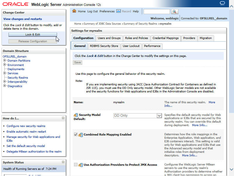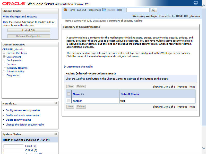 - Login to WebLogic server administration console and click Security Realms in left panel.The following window is displayed.