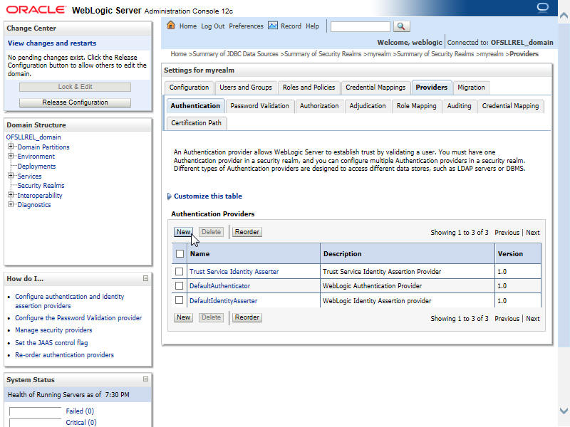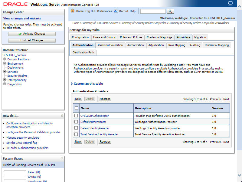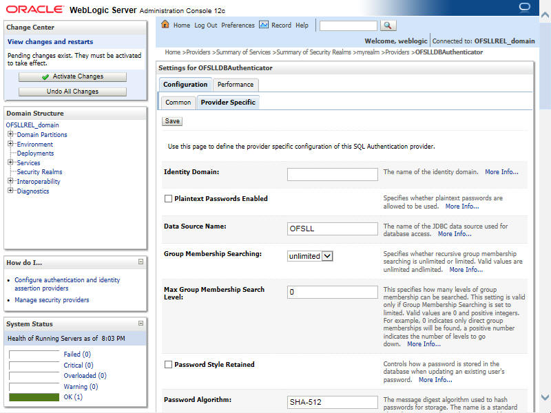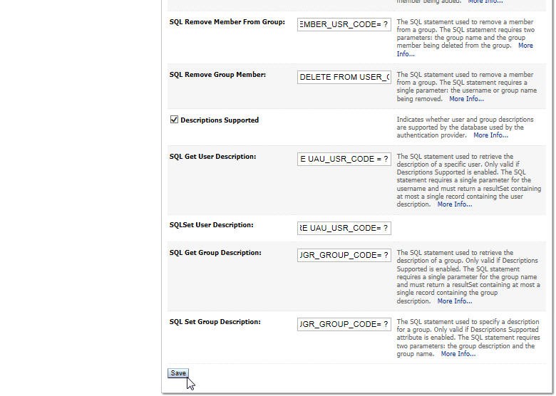 Operation Default SQL Query from Weblogic Corresponding SQL Queries as per our Tables SQL Get Users Password: SELECT U_PASSWORD FROM USERS WHERE U_NAME = ? SELECT UAU_USR_PASSWORD FROM USER_AUTHORISATIONS WHERE UAU_USR_CODE = ? SQL Set User Password: UPDATE USERS SET U_PASSWORD = ? WHERE U_NAME = ? UPDATE USER_AUTHORISATIONS SET UAU_USR_PASSWORD = ? WHERE UAU_USR_CODE = ? SQL User Exists: SELECT U_NAME FROM USERS WHERE U_NAME = ? SELECT UAU_USR_CODE FROM USER_AUTHORISATIONS WHERE UAU_USR_CODE = ? SQL List Users: SELECT U_NAME FROM USERS WHERE U_NAME LIKE ? SELECT UAU_USR_CODE FROM USER_AUTHORISATIONS WHERE UAU_USR_CODE LIKE ? SQL Create User: INSERT INTO USERS VALUES ( ? , ? , ? ) INSERT INTO USER_AUTHORISATIONS(UAU_USR_CODE, UAU_USR_PASSWORD,UAU_DESC) VALUES(?,?,?) SQL Remove User: DELETE FROM USERS WHERE U_NAME = ? DELETE FROM USER_AUTHORISATIONS WHERE UAU_USR_CODE= ? SQL List Groups: SELECT G_NAME FROM GROUPS WHERE G_NAME LIKE ? SELECT UGR_GROUP_CODE FROM USER_GROUPS WHERE UGR_GROUP_CODE LIKE ? SQL Group Exists: SELECT G_NAME FROM GROUPS WHERE G_NAME = ? SELECT UGR_GROUP_CODE FROM USER_GROUPS WHERE UGR_GROUP_CODE = ? SQL Create Group: INSERT INTO GROUPS VALUES ( ? , ? ) INSERT INTO USER_GROUPS(UGR_GROUP_CODE,UGR_GROUP_DESC) VALUES(?,?) SQL Remove Group: DELETE FROM GROUPS WHERE G_NAME = ? DELETE FROM USER_GROUPS WHERE UGR_GROUP_CODE = ? SQL Is Member: SELECT G_MEMBER FROM GROUPMEMBERS WHERE G_NAME = ? AND G_MEMBER = ? SELECT UGM_MEMBER_USR_CODE FROM USER_GROUP_MEMBERS WHERE UGM_MEMBER_GROUP_CODE= ? AND UGM_MEMBER_USR_CODE = ? SQL List Member Groups: SELECT G_NAME FROM GROUPMEMBERS WHERE G_MEMBER = ? SELECT UGM_MEMBER_GROUP_CODE FROM USER_GROUP_MEMBERS WHERE UGM_MEMBER_USR_CODE= ? SQL List Group Members: SELECT G_MEMBER FROM GROUPMEMBERS WHERE G_NAME = ? AND G_MEMBER LIKE ? SELECT UGM_MEMBER_USR_CODE FROM USER_GROUP_MEMBERS WHERE UGM_MEMBER_GROUP_CODE= ? AND UGM_MEMBER_USR_CODE LIKE ? SQL Remove Group Memberships: DELETE FROM GROUPMEMBERS WHERE G_MEMBER = ? OR G_NAME = ? DELETE FROM USER_GROUP_MEMBERS WHERE UGM_MEMBER_USR_CODE= ? OR UGM_MEMBER_GROUP_CODE= ? SQL Add Member To Group: INSERT INTO GROUPMEMBERS VALUES( ?, ?) INSERT INTO USER_GROUP_MEMBERS (UGM_MEMBER_GROUP_CODE,UGM_MEMBER_USR_CODE) VALUES(?,?) SQL Remove Member From Group: DELETE FROM GROUPMEMBERS WHERE G_NAME = ? AND G_MEMBER = ? DELETE FROM USER_GROUP_MEMBERS WHERE UGM_MEMBER_GROUP_CODE= ? AND UGM_MEMBER_USR_CODE= ? SQL Remove Group Member: DELETE FROM GROUPMEMBERS WHERE G_NAME = ? DELETE FROM USER_GROUP_MEMBERS WHERE UGM_MEMBER_GROUP_CODE= ? SQL Get User Description: SELECT U_DESCRIPTION FROM USERS WHERE U_NAME = ? SELECT UAU_DESC FROM USER_AUTHORISATIONS WHERE UAU_USR_CODE = ? SQLSet User Description: UPDATE USERS SET U_DESCRIPTION = ? WHERE U_NAME = ? UPDATE USER_AUTHORISATIONS SET UAU_DESC= ? WHERE UAU_USR_CODE= ? SQL Get Group Description: SELECT G_DESCRIPTION FROM GROUPS WHERE G_NAME = ? SELECT UGR_GROUP_DESC FROM USER_GROUPS WHERE UGR_GROUP_CODE= ? SQL Set Group Description: UPDATE GROUPS SET G_DESCRIPTION = ? WHERE G_NAME = ? UPDATE USER_GROUPS SET UGR_GROUP_DESC= ? WHERE UGR_GROUP_CODE= ? Provider Name OFSLLDBAuthenticator - Click Save.