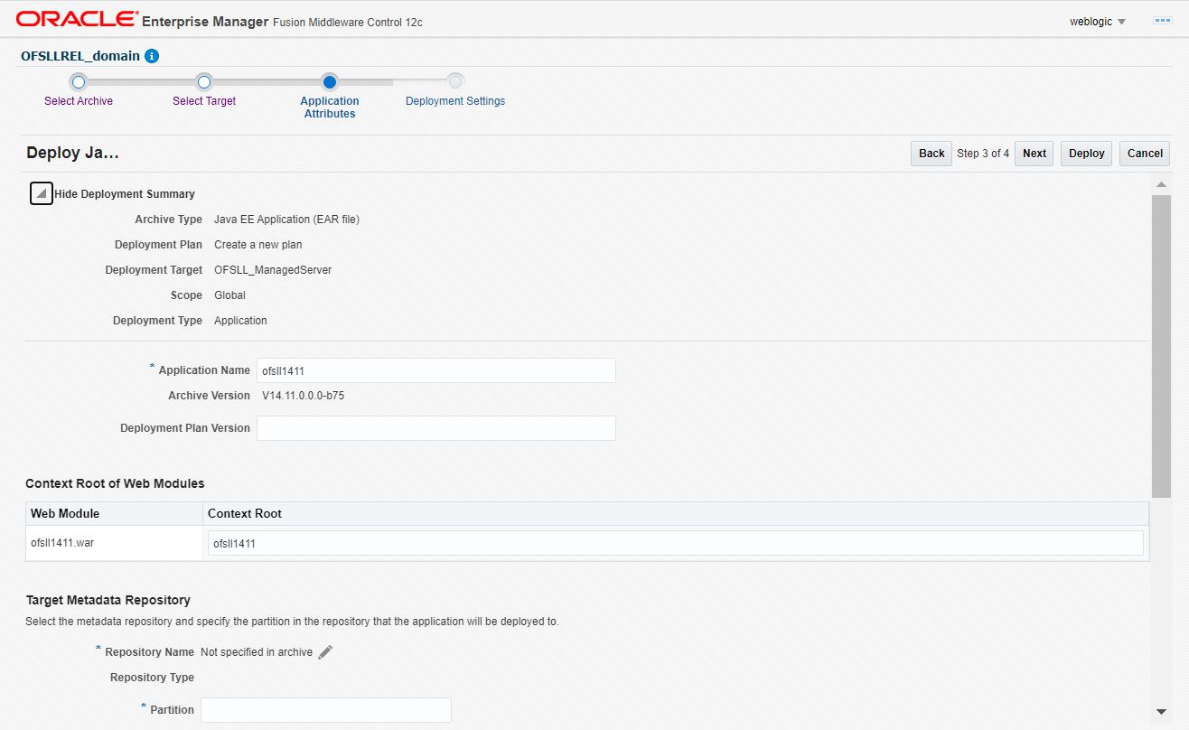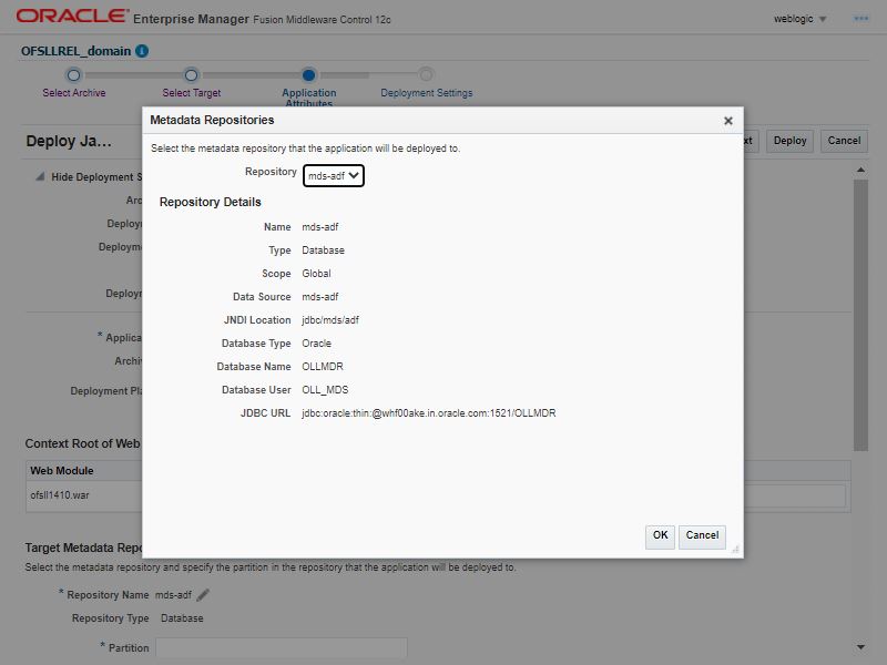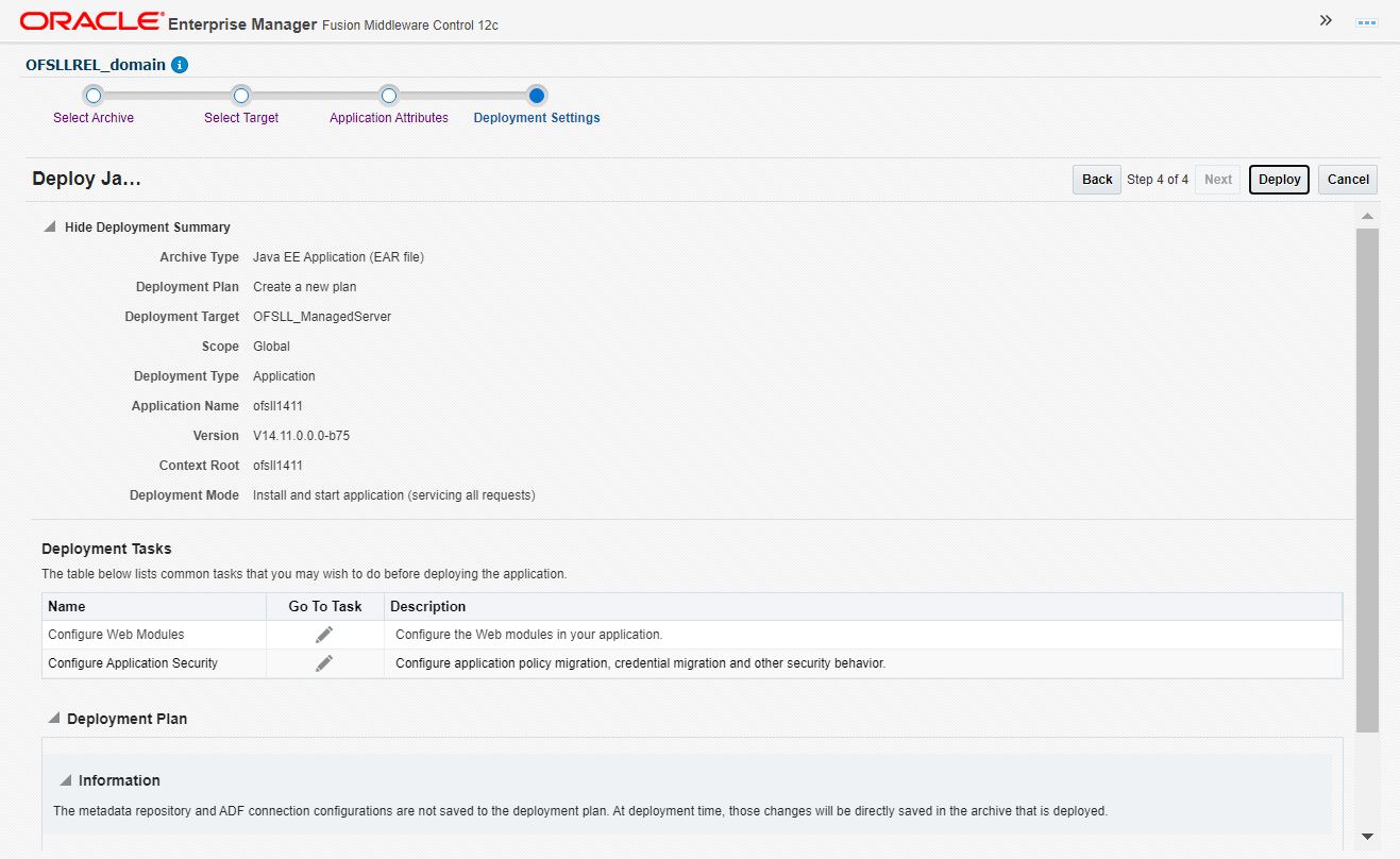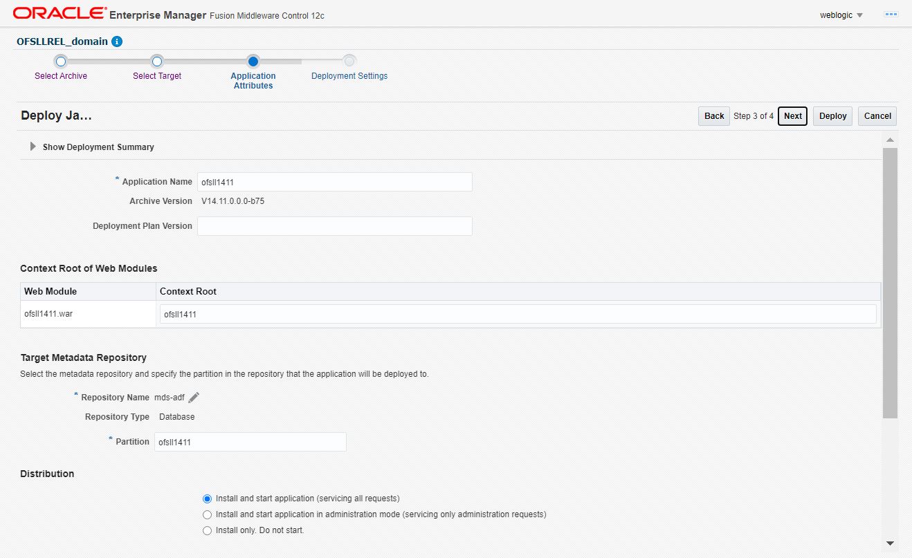Application Installation Guide Deploy Application 4 Deploy Application The following section details the steps to deploy Application. Deploying Application 4.1 Deploying Application Login to the Oracle Enterprise Manager 12c console . (i.e. http://hostname:port/em) Figure 4-1 Deploying Application 1Description of "Figure 4-1 Deploying Application 1" Click on Lock and Edit as shown below. Figure 4-2 Deploying Application 2Description of "Figure 4-2 Deploying Application 2" The following window is displayed. Figure 4-3 Deploying Application 3Description of "Figure 4-3 Deploying Application 3" Click on Deployments in the left panel. To deploy go to Deployments option in the menu as shown below. Figure 4-4 Deploying Application 4Description of "Figure 4-4 Deploying Application 4" Click Choose File button and select OFSLL application archive file i.e. ofsll_1411.ear. Choose the Deployment Plan (if any). Figure 4-5 Deploying Application 5Description of "Figure 4-5 Deploying Application 5" Note:A deployment plan can be used to easily change an application's WebLogic Server configuration for a specific environment without modifying existing deployment descriptors. Sample plan.xml Figure 4-6 Deploying Application 6Description of "Figure 4-6 Deploying Application 6" Click Next.The following window is displayed. Figure 4-7 Deploying Application 7Description of "Figure 4-7 Deploying Application 7" Check target server as per the requirement OFSLL_ManagedServer and click Next. Figure 4-8 Deploying Application 8Description of "Figure 4-8 Deploying Application 8" Click button to select Repository Name.The following window is displayed. Figure 4-9 Deploying Application 9Description of "Figure 4-9 Deploying Application 9" Select Repository as per requirement and click OK. Figure 4-10 Deploying Application 10Description of "Figure 4-10 Deploying Application 10" Enter Partition name as per the requirement and click Next. Figure 4-11 Deploying Application 11Description of "Figure 4-11 Deploying Application 11" Click Deploy. The following window is displayed. Figure 4-12 Deploying Application 12Description of "Figure 4-12 Deploying Application 12" Click Close once the message Deploy operation completed is displayed. Parent topic: Deploy Application
