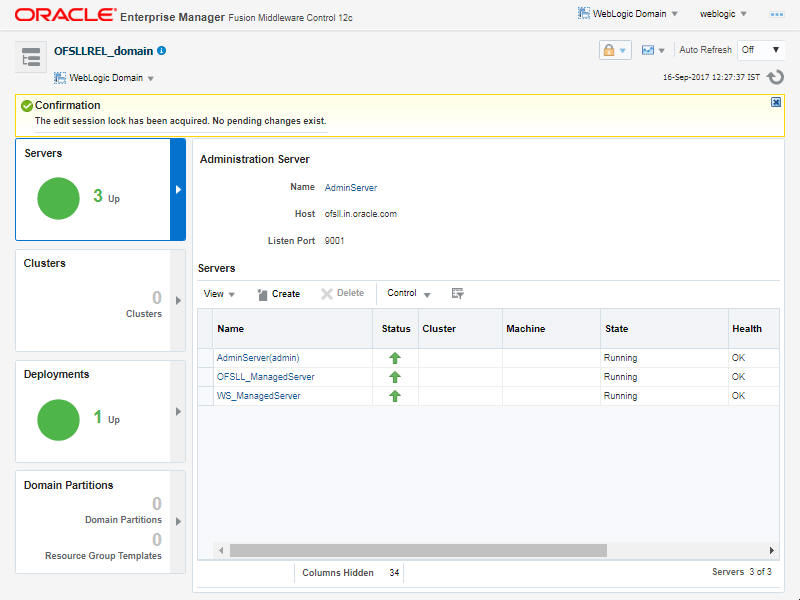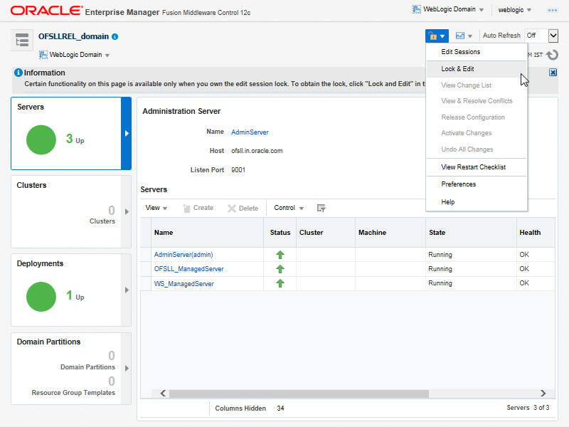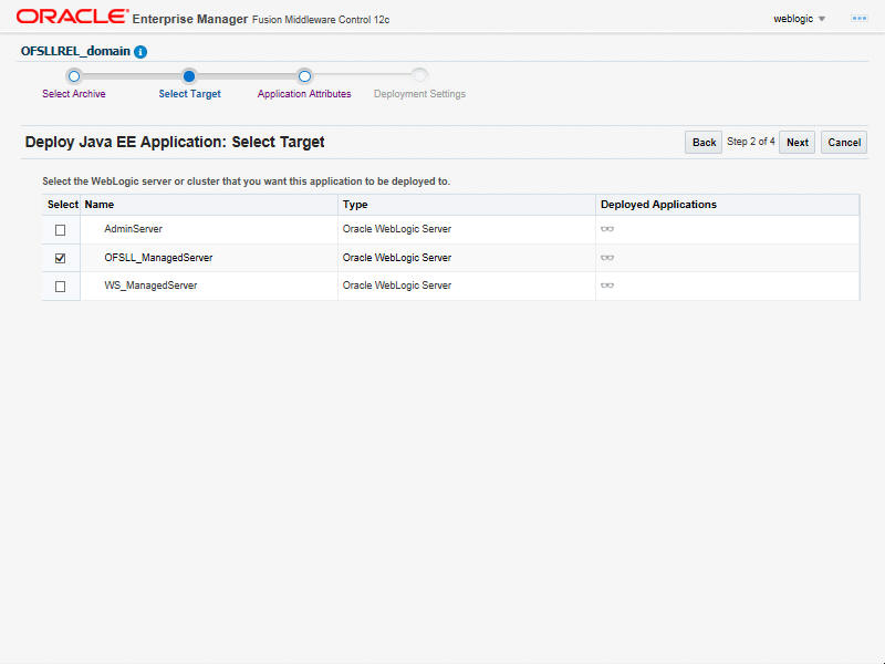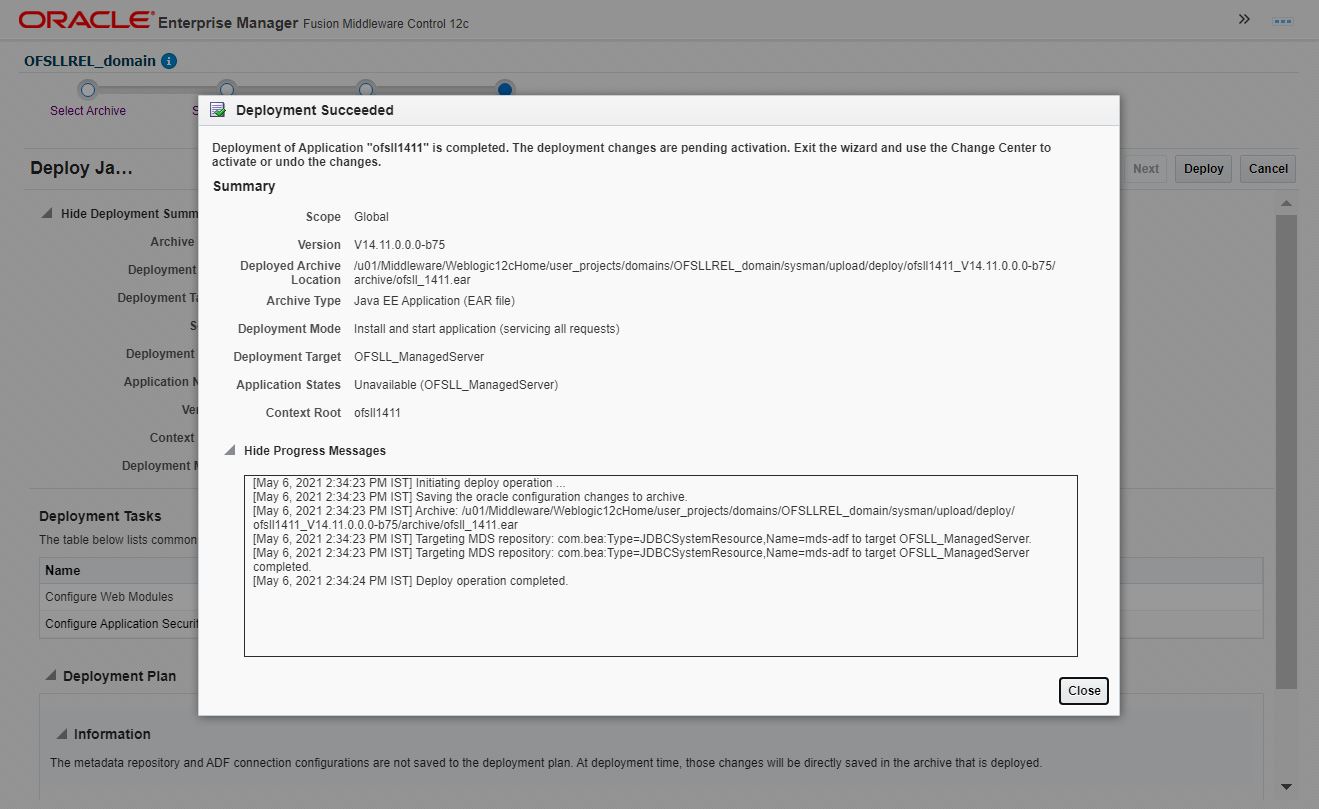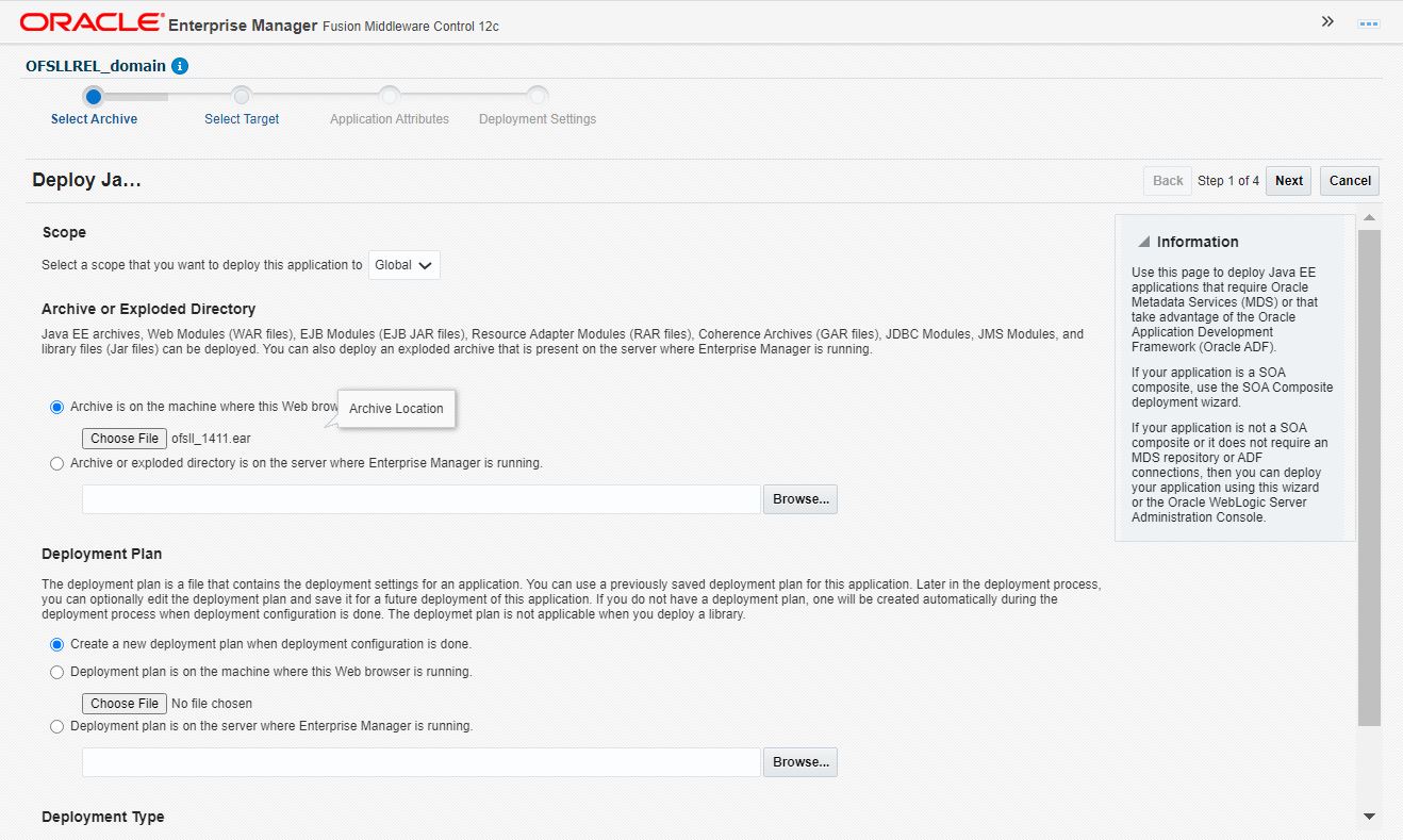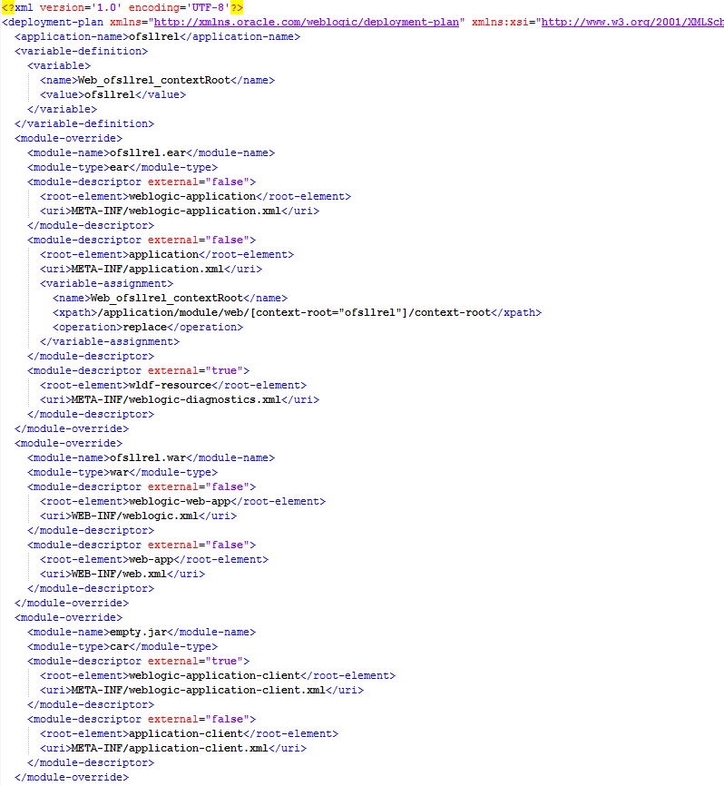 Application Installation Guide Deploy Application 4 Deploy Application The following section details the steps to deploy Application. Deploying Application 4.1 Deploying Application Login to the Oracle Enterprise Manager 12c console . (i.e. http://hostname:port/em) Figure 4-1 Deploying Application 1Description of "Figure 4-1 Deploying Application 1" Click on Lock and Edit as shown below. Figure 4-2 Deploying Application 2Description of "Figure 4-2 Deploying Application 2" The following window is displayed. Figure 4-3 Deploying Application 3Description of "Figure 4-3 Deploying Application 3" Click on Deployments in the left panel. To deploy go to Deployments option in the menu as shown below. Figure 4-4 Deploying Application 4Description of "Figure 4-4 Deploying Application 4" Click Choose File button and select OFSLL application archive file i.e. ofsll_1411.ear. Choose the Deployment Plan (if any). Figure 4-5 Deploying Application 5Description of "Figure 4-5 Deploying Application 5" Note:A deployment plan can be used to easily change an application's WebLogic Server configuration for a specific environment without modifying existing deployment descriptors. Sample plan.xml Figure 4-6 Deploying Application 6Description of "Figure 4-6 Deploying Application 6" Click Next.The following window is displayed. Figure 4-7 Deploying Application 7Description of "Figure 4-7 Deploying Application 7" Check target server as per the requirement OFSLL_ManagedServer and click Next. Figure 4-8 Deploying Application 8Description of "Figure 4-8 Deploying Application 8" Click button to select Repository Name.The following window is displayed. Figure 4-9 Deploying Application 9Description of "Figure 4-9 Deploying Application 9" Select Repository as per requirement and click OK. Figure 4-10 Deploying Application 10Description of "Figure 4-10 Deploying Application 10" Enter Partition name as per the requirement and click Next. Figure 4-11 Deploying Application 11Description of "Figure 4-11 Deploying Application 11" Click Deploy. The following window is displayed. Figure 4-12 Deploying Application 12Description of "Figure 4-12 Deploying Application 12" Click Close once the message Deploy operation completed is displayed. Parent topic: Deploy Application