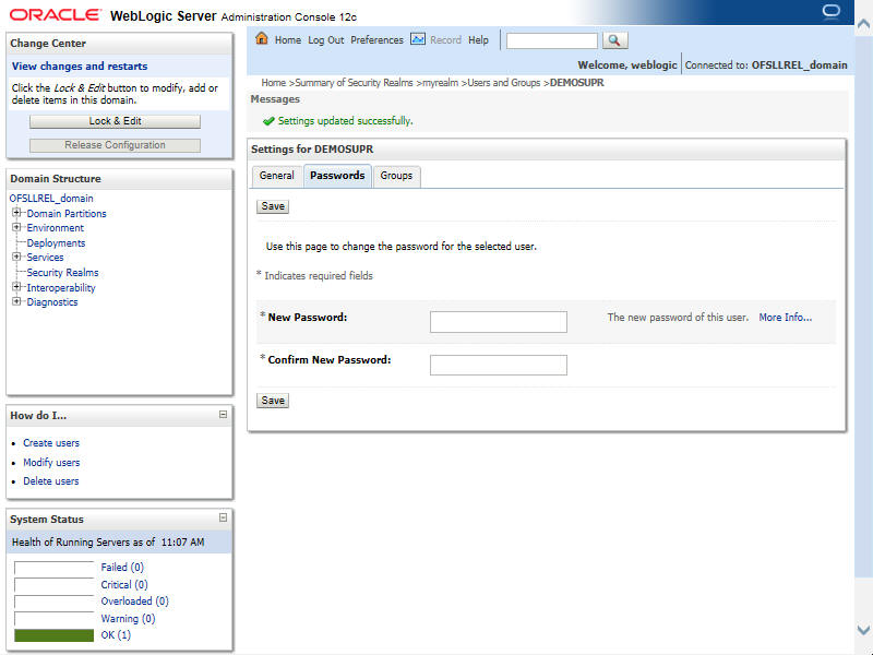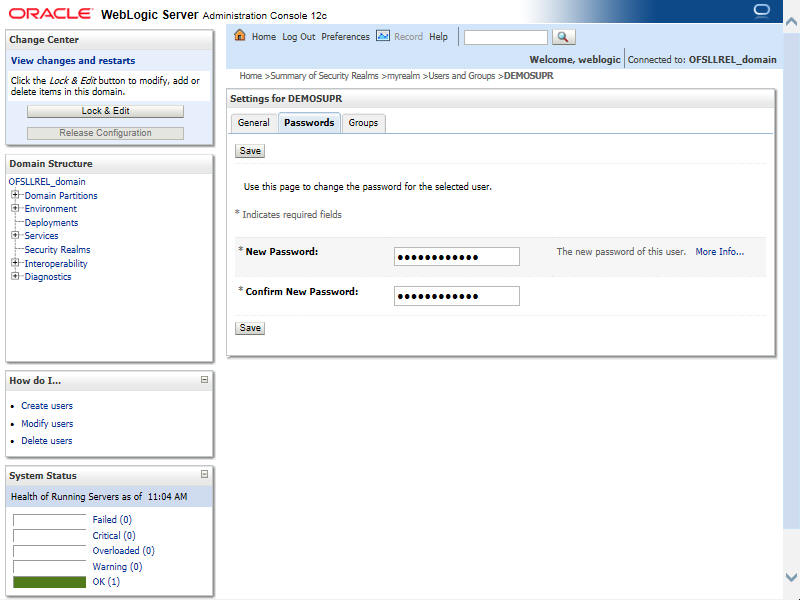 Application Installation Guide Create Domains, Repositories, Data Sources Creating User Groups and Users Resetting password via weblogic console 2.6.4 Resetting password via weblogic console Click on User. Select Passwords tab and enter new password and confirm password. Figure 2-64 User Group 5Description of "Figure 2-64 User Group 5" Click Save.The following window displayed. Figure 2-65 User Group 6Description of "Figure 2-65 User Group 6" Parent topic: Creating User Groups and Users