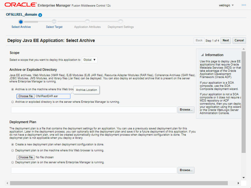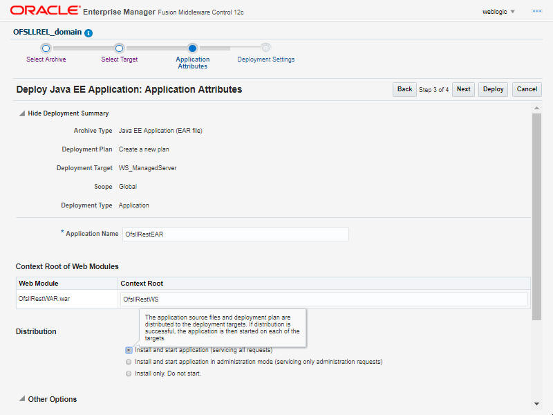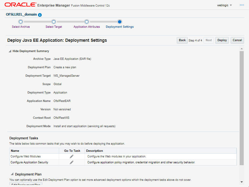 WebServices Installation Guide Configure RESTful WebService Deploying RESTful WebService 6.4 Deploying RESTful WebService Please follow the below steps to deploy RESTful WebService. Login to Web Logic application server enterprise manager (e.g.: http://hostname:port/em) Figure 6-14 Deploy RESTful WebService 1Description of "Figure 6-14 Deploy RESTful WebService 1" Enter valid login credentials. The following window is displayed. Figure 6-15 Deploy RESTful WebService 2Description of "Figure 6-15 Deploy RESTful WebService 2" Select Lock & Edit option in the lock drop-down list available in the header. Click Deployment in the left panel. Select Lock & Editoption in the lock drop-down list available in the header. The following window is displayed. Figure 6-16 Deploy RESTful WebService 3Description of "Figure 6-16 Deploy RESTful WebService 3" Select Deploy from the Deployment drop-down list.The following window is displayed. Figure 6-17 Deploy RESTful WebService 4Description of "Figure 6-17 Deploy RESTful WebService 4" The following window is displayed. Figure 6-18 Deploy RESTful WebService 5 Description of "Figure 6-18 Deploy RESTful WebService 5 " Browse to the folder containing the WebService. Eg: C:/OfsllRestEAR.ear Click Next. The following window is displayed. Figure 6-19 Deploy RESTful WebService 6Description of "Figure 6-19 Deploy RESTful WebService 6" Select the server on which the WebService needs to be deployed. Click Next. The following window is displayed. Figure 6-20 Deploy RESTful WebService 7Description of "Figure 6-20 Deploy RESTful WebService 7" Select the option Install and start application (servicing all requests). Check the context root and click Next. The following window is displayed. Figure 6-21 Deploy RESTful WebService 8Description of "Figure 6-21 Deploy RESTful WebService 8" Click Deploy . On successful deployment, the following window is displayed. Figure 6-22 Deploy RESTful WebService 9Description of "Figure 6-22 Deploy RESTful WebService 9" Click Close. Post deployment, you need to activate the changes by selecting Active Changes option from Edit Session drop-down list as indicated in step 4 above. The next step is to Identifying the RESTful Webservice URL. Identifying the RESTful Webservice URL Parent topic: Configure RESTful WebService