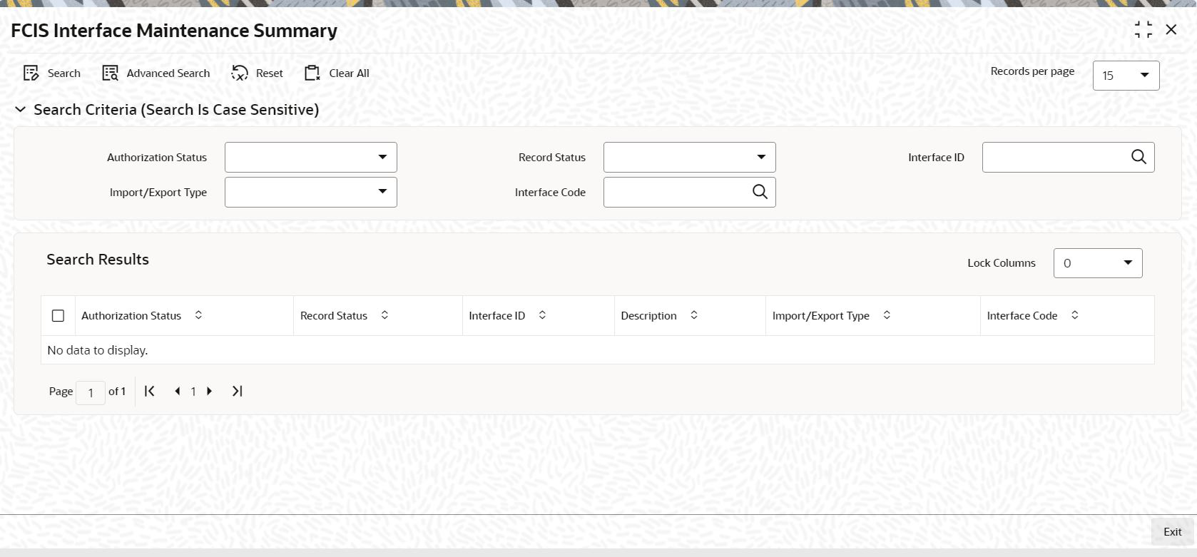 2. On FCIS Interface Maintenance Summary screen, specify any or all of the following details in the corresponding fields: