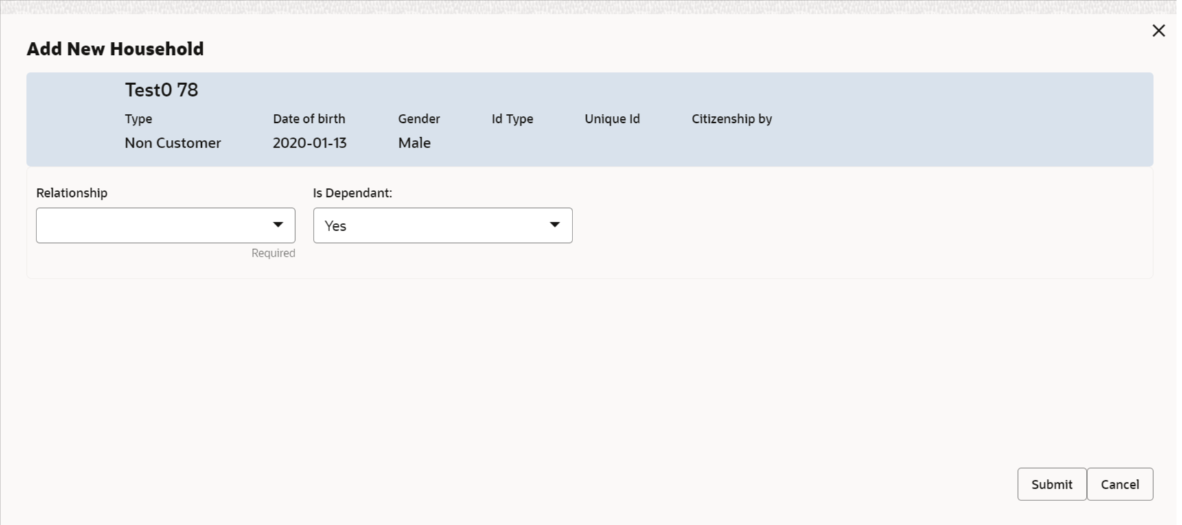 to select desired relationship.The Add New Household screen displays.Relationships with a customer can be either of the following:- An existing party that is a customer of the bank