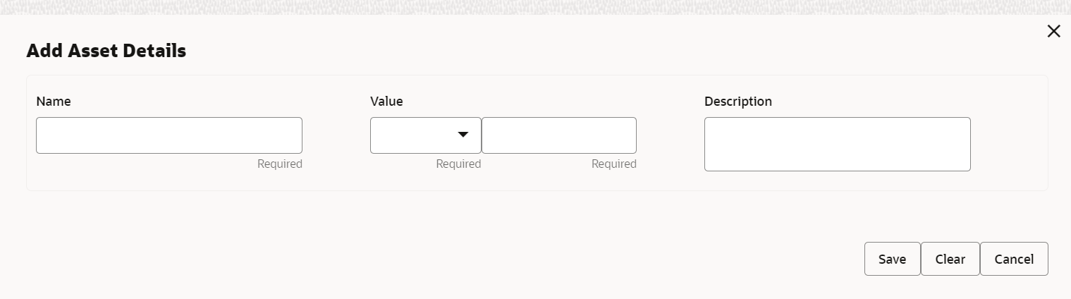 The fields marked as Required are mandatory.This topic provides the systematic instruction to add the details about the assets of the Small and Medium Enterprise customer.