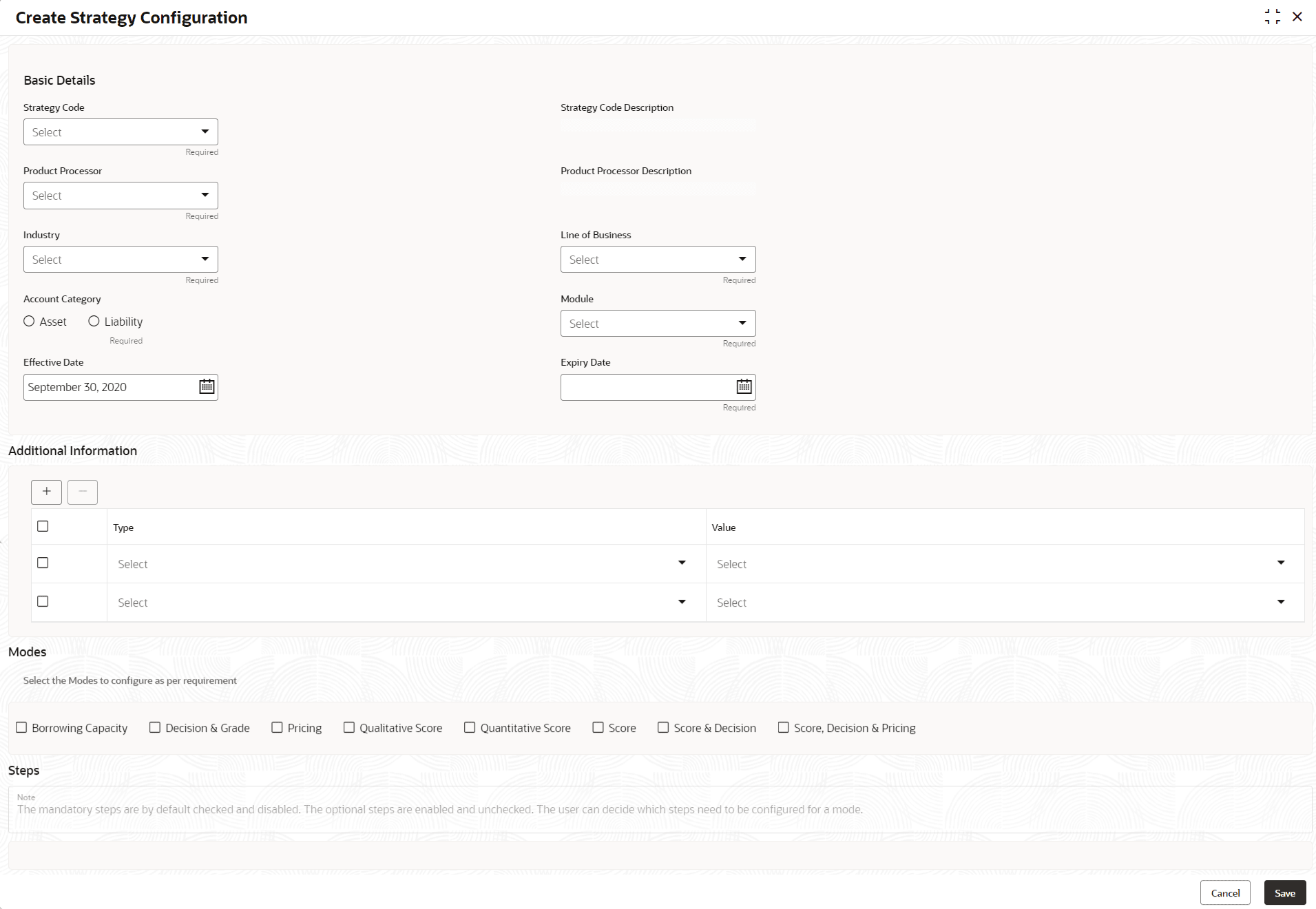 Account Category Indicates whether the strategy created is for asset or Liabilities. Module Select the module from the drop-down list . The values are configurable based on the lookup values maintained.