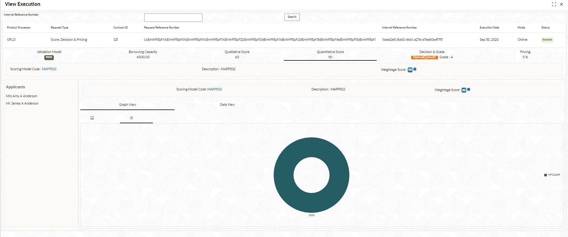 The calculation logic for the feature is (Weighted score of the feature/ Weightage score of the applicant)*100. The pie is shown from a pool of colors available/defined in the code.Data View The scoring details are shown as mentioned below in data view. Feature Displays the features resolved for the applicant in the scoring model. Click the hyperlink to view the rule executed to resolve the quantitative score.