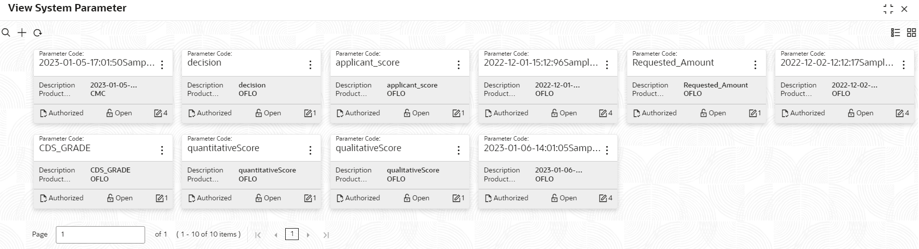 Field Description Parameter Code Displays the parameter code. Description Displays the description of the parameter code. Product Processor Displays the product processor of the parameter. Authorization Status Displays the authorization status of the record. The options are:- Authorized