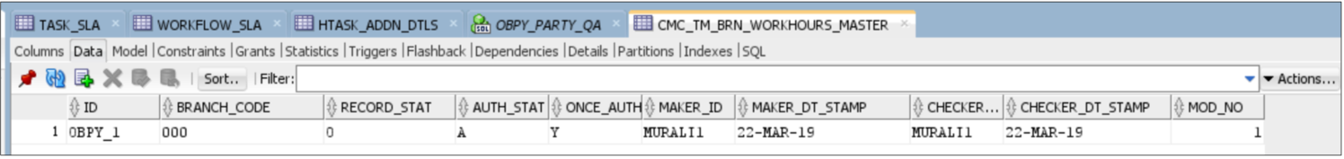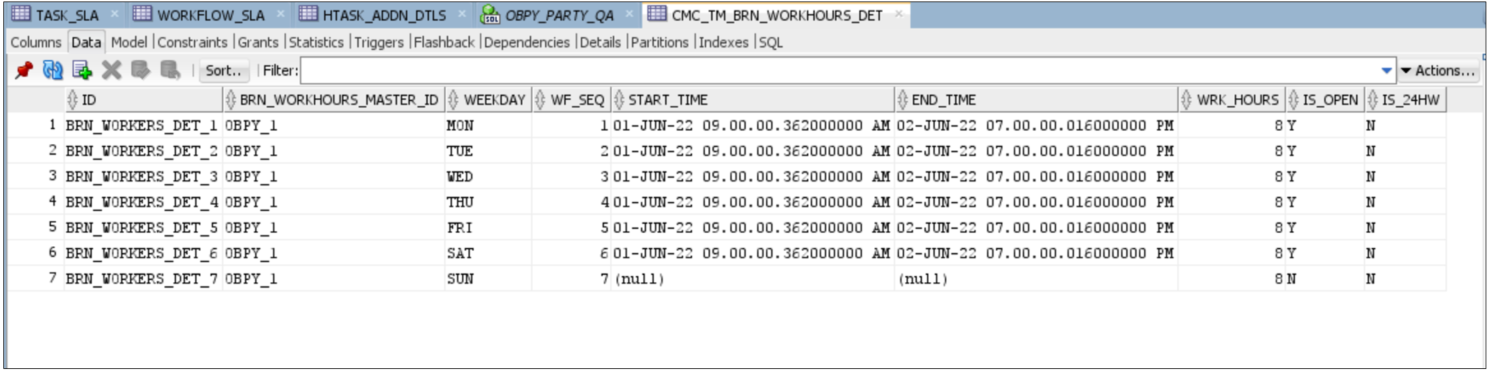 CMC_TM_BRN_WORKHOURS_DET in CMCORE schema tables for SLA calculation as follows: