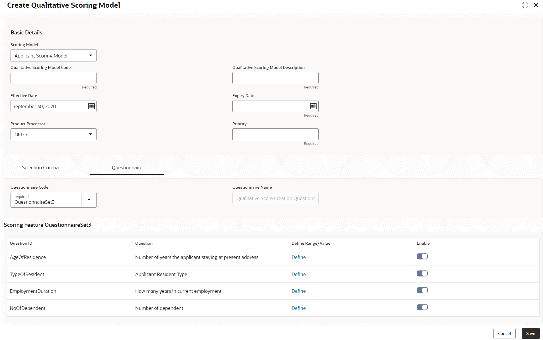 Field Description Questionnaire Code Select the questionnaire code from the drop-down list. It will list down all the questionnaire created as a part of create questionnaire. Questionnaire Name Displays the questionnaire name of the selected questionnaire code. Question ID Displays the question ID in the questionnaire. Question Displays the question description linked to the question ID. Define Range/Value Click the Define link to define the score for the expected response. Enable By default, this option is enabled. Indicates if the question ID is enabled or not. - Click the Define link to define a range or absolute values for questions. The Create Qualitative Scoring Model - Define Link screen displays.For more information on fields, refer to the field description table.