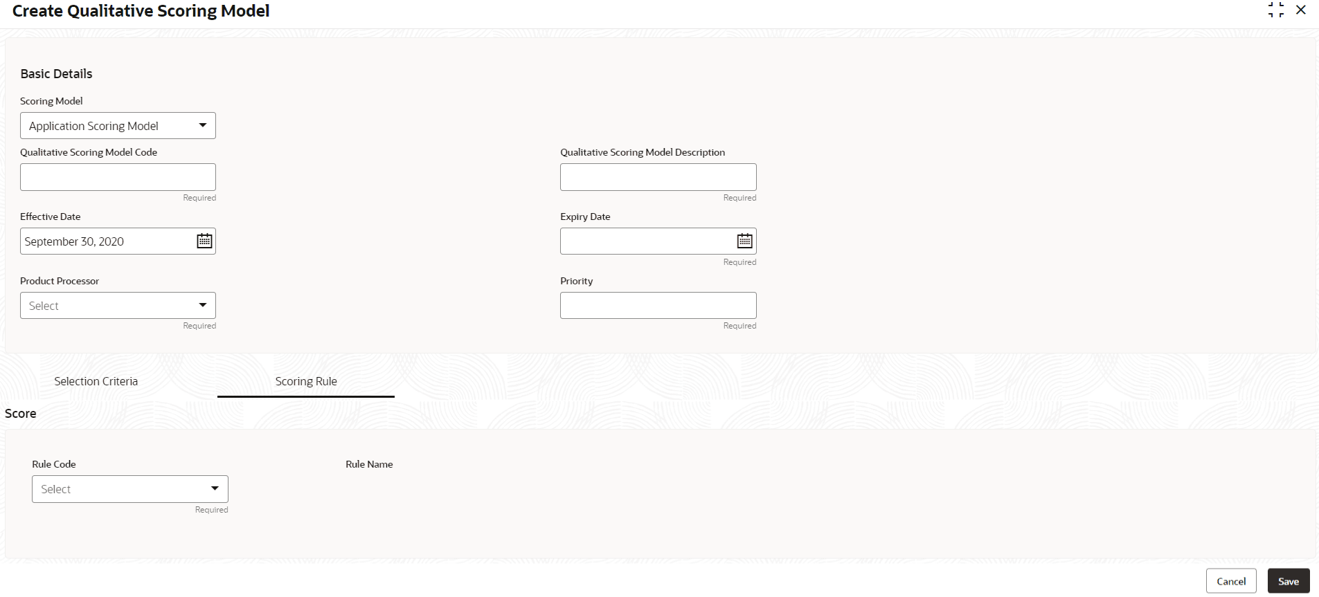 Qualitative Scoring Model Code Specify the unique scoring model code. Qualitative Scoring Model Description Specify a short description for the scoring model. Effective Date Specify the effective date. Expiry Date Specify the expiry date. Product Processor Specify the product processor for which the model is being created. Priority Specify the priority of the model. - Click the Selection Criteria to define qualitative scoring model.The Create Qualitative Scoring Model - Selection Criteria screen displays.For more information on fields, refer to the field description table.