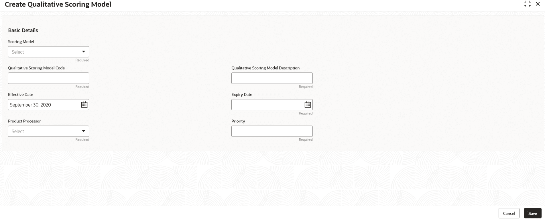 - On Create Qualitative Scoring Model screen, specify the fields.For more information on fields, refer to the field description table.