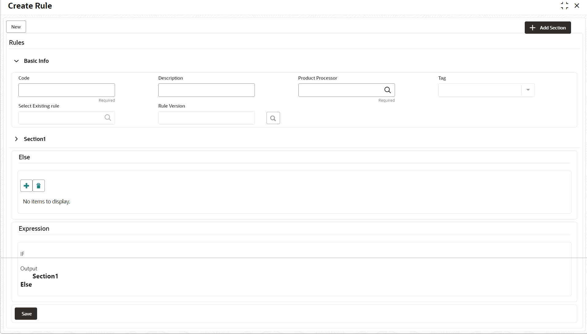 Field Description Code Specify the alphanumeric code without space for the rule. Description Specify the description of the rule. Product Processor Click Search and select the product processor. Tag Select the tag from the drop-down list. Select Existing Rule Click Search and select the existing rule. Add Section Click Add Section to create the multiple rule condition. Expression Builder Select the expressions to build the rule. Add Expression Click Add Expression to create the expression for the rule. + Icon Click + icon to add new expression. Fact / Rules Select the fact or rule from the drop-down list. Operator Select the comparison operator from the drop-down list. Data Type Select the data type for the fact or rule. Once the user select the data type, one more field opens adjacent to the output, update the same based on the selected output option.
