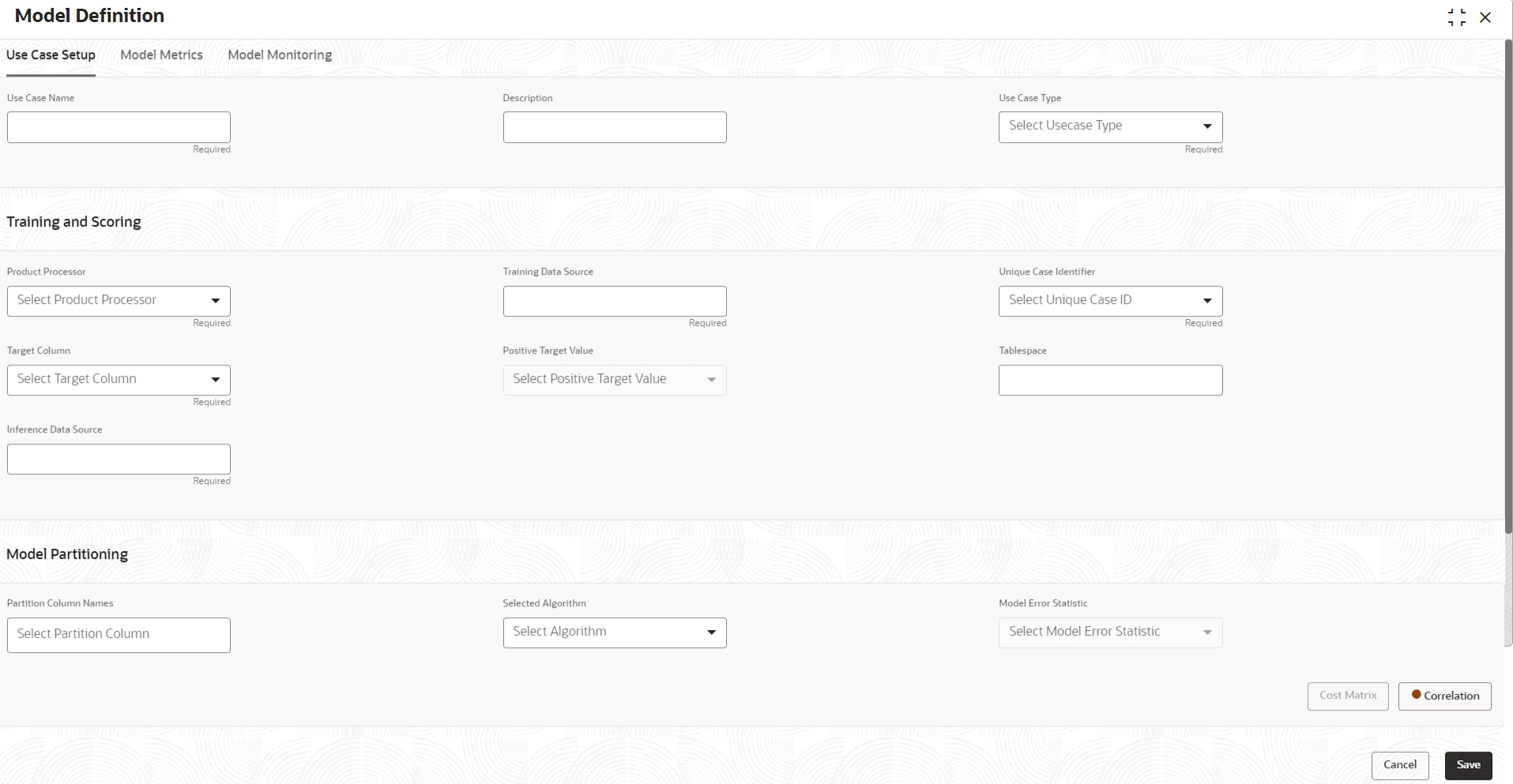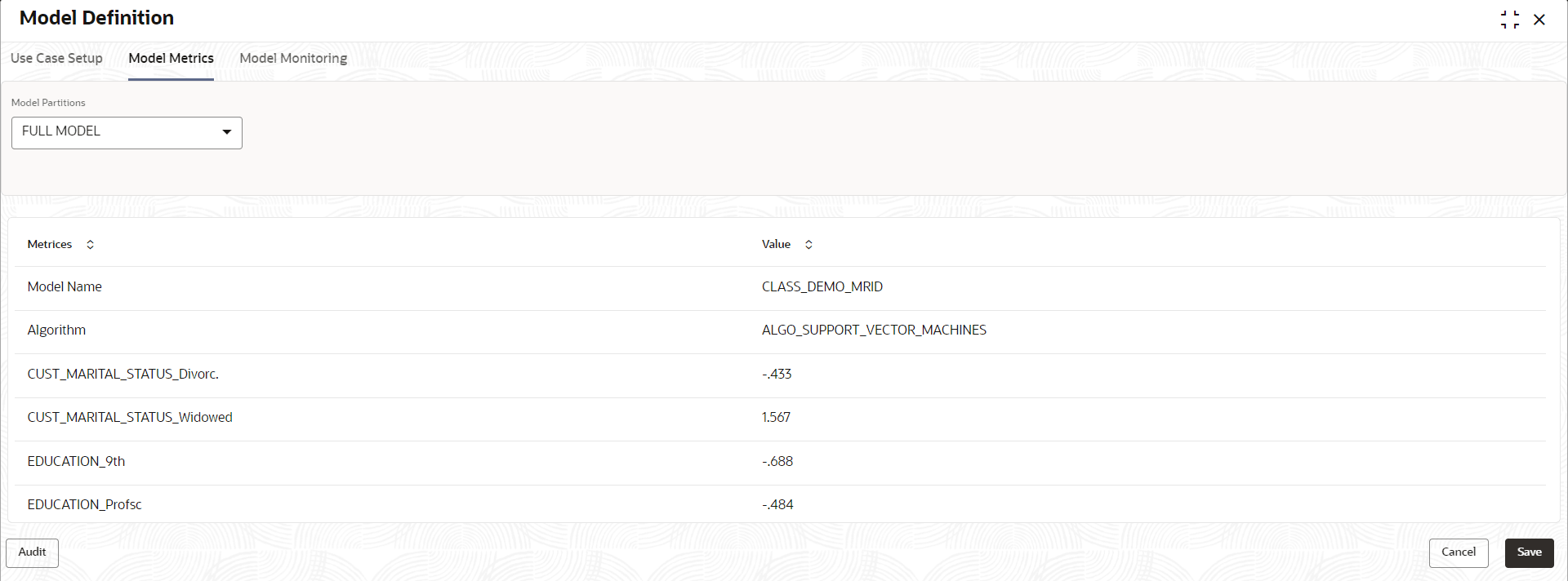 The Model Metrices screen displays. For more information on fields, refer to the field description table.