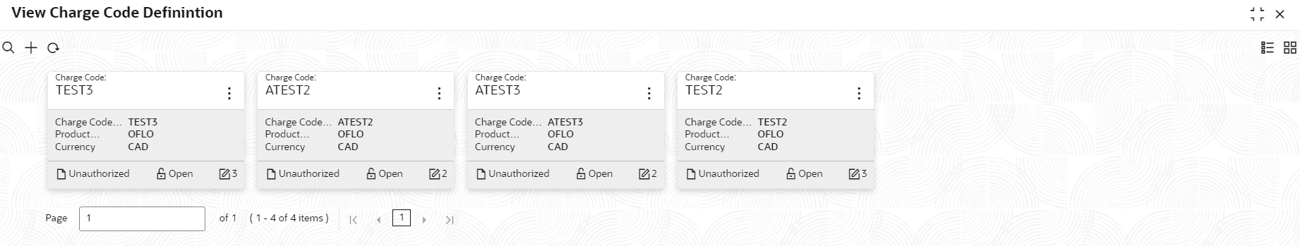 Field Description Charge Code Displays the charge code. Charge Code Description Displays the description of the charge code. Product Processor Code Displays the product processor of the charge code. Charging Currency Displays the currency of the charge code. Status Displays the status of the record. Modification Number Displays the number of modifications performed on the record. - On View Charge Code screen, click