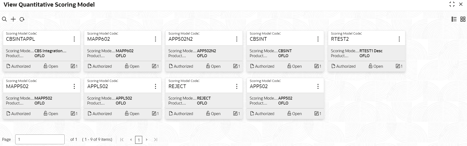Field Description Scoring Model Code Displays the scoring model code. Scoring Model Description Displays the description of the scoring model. Product Processor Code Displays the product processor code Authorization Status Displays the authorization status of the record. The options are:- Authorized