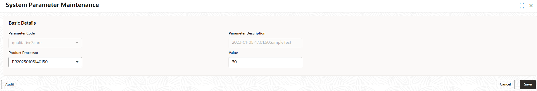 Field Description Parameter Code Displays the created parameter code. Parameter Description Displays the created parameter description. Product Processor Specify the product processor of the created parameter. Value Specify the value for the created parameter. - Click Save to update the modified fields.